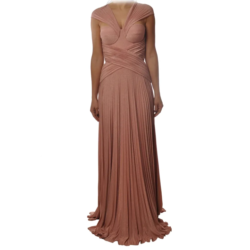 Elisabetta Franchi dress, long model in laminated pleated fabric, with cup bodice and fabric detail on the neckline, zip on the back, with double side slit, body inside.