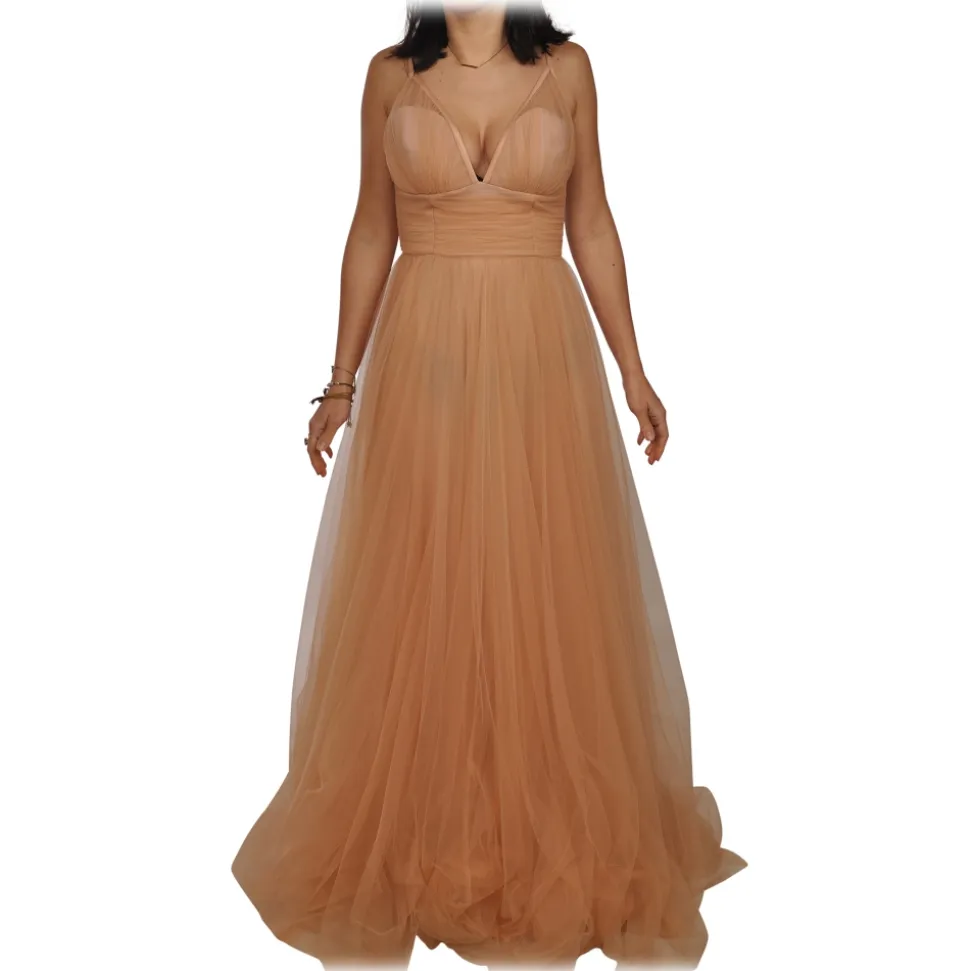 Elisabetta Franchi – Long Tulle Dress with Pleated Skirt – Beige – Dress – Made in Italy – Luxury Exclusive Collection