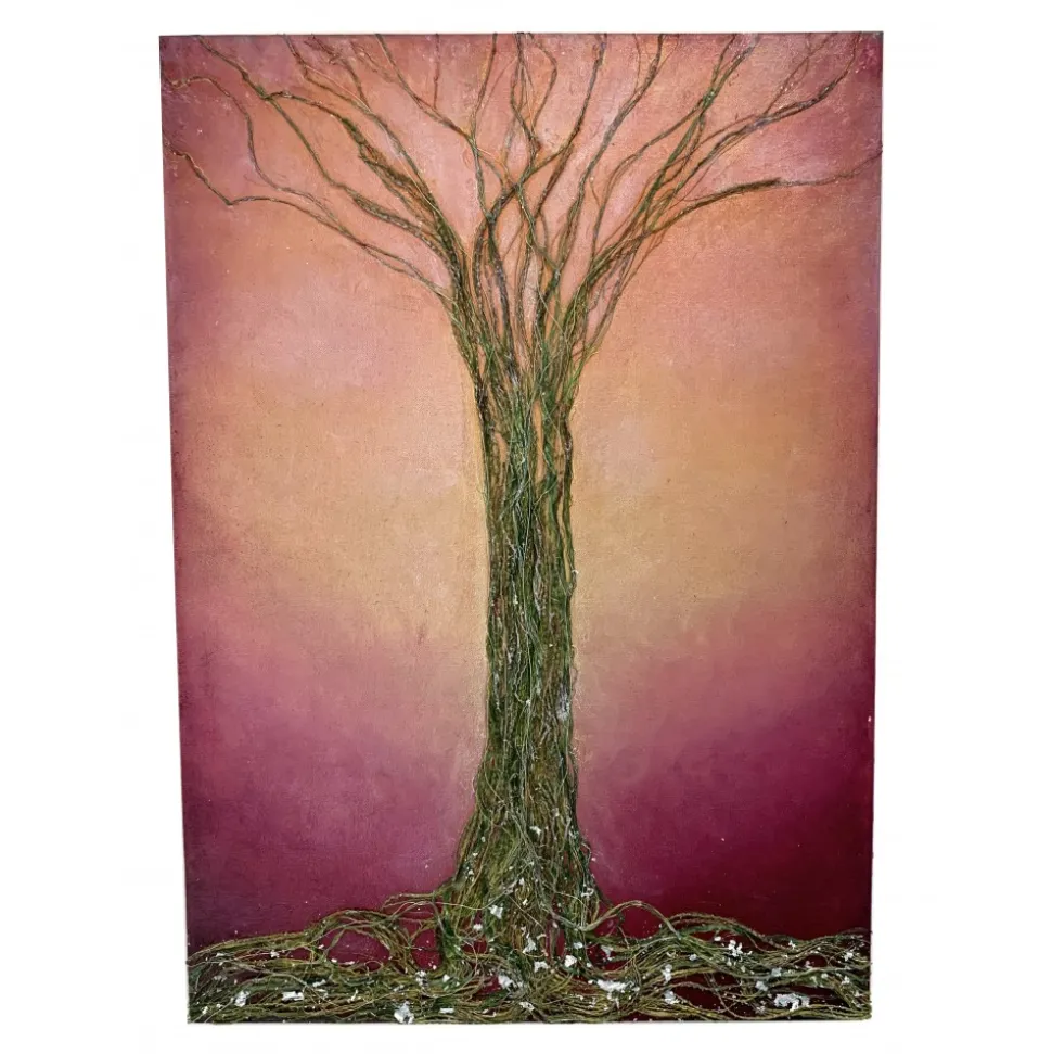 Eliza Oynus, born in Tallinn (Estonia), studied at the University of Technology and Design in St. Petersburg, Karlsruhe (University Kit) and Venice (IUAV University). In her works she represents nature and flora with its blooming beauty, its fauna with its strength and calm. Using a mixed technique with threads of fabric, oil and gold leaves that give volume and brightness to the work as well as a sense of reality and depth, the picture becomes material and invites you to explore.