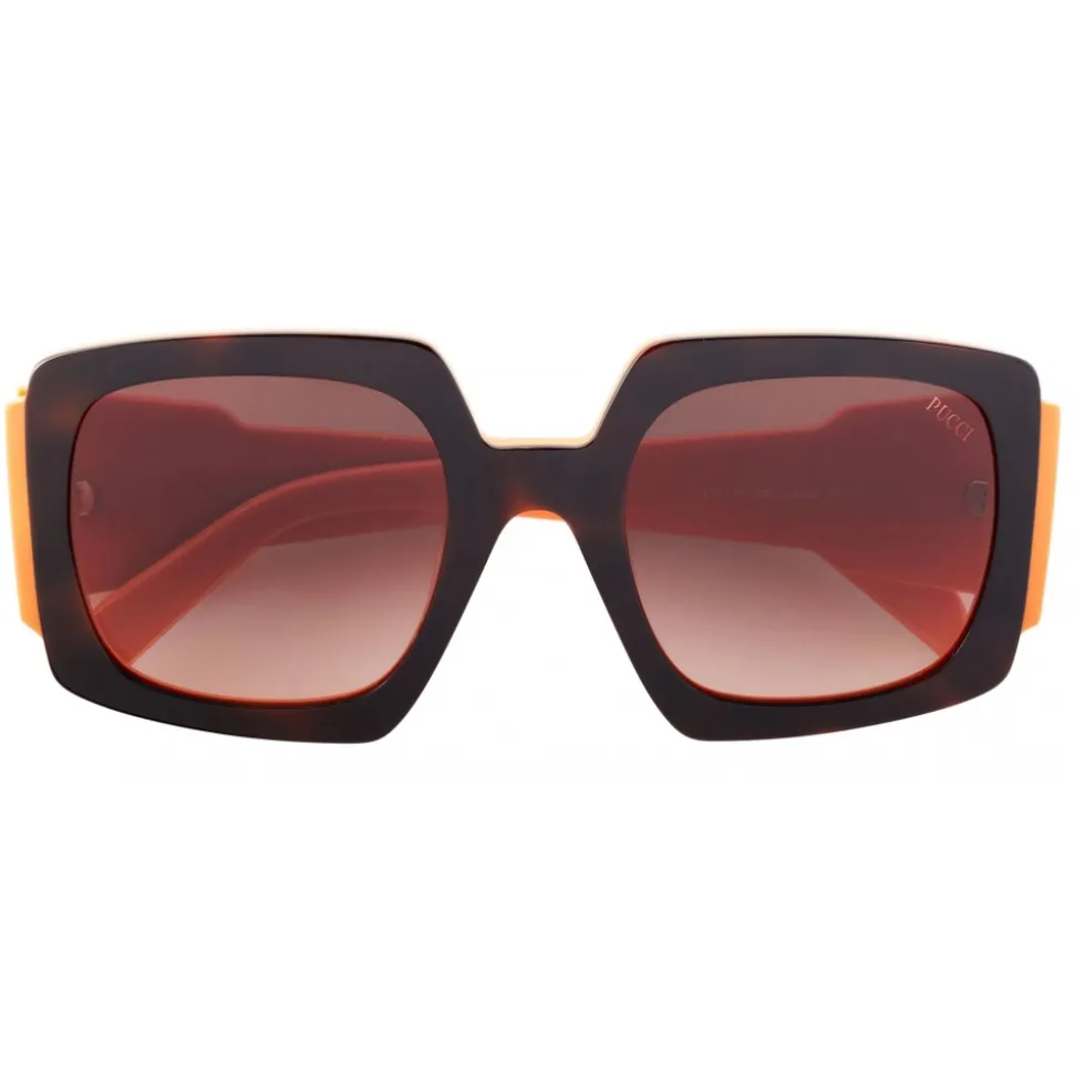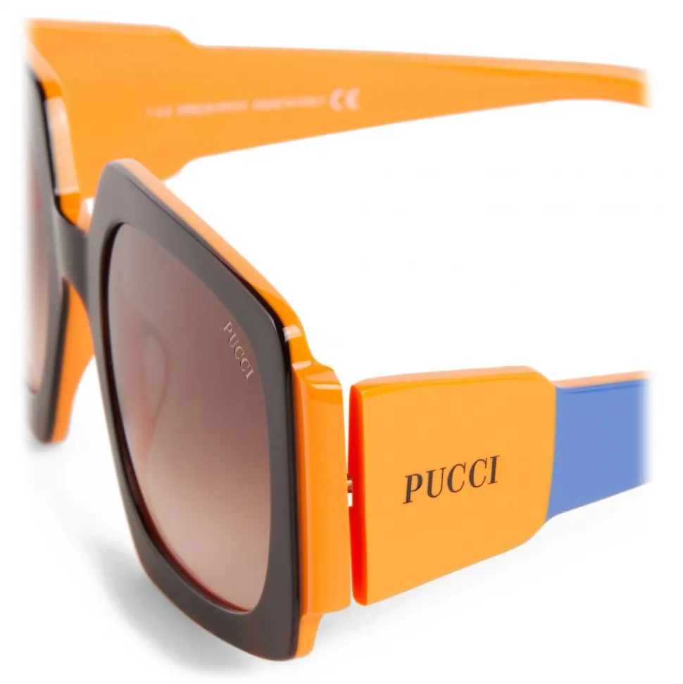 Glamour meets tropical inspiration in these statement sunglasses, which combine exaggerated square frames with colour blocked arms in vivid shades of orange and blue. Brown gradient lenses and a signature Pucci logo complete the design.
