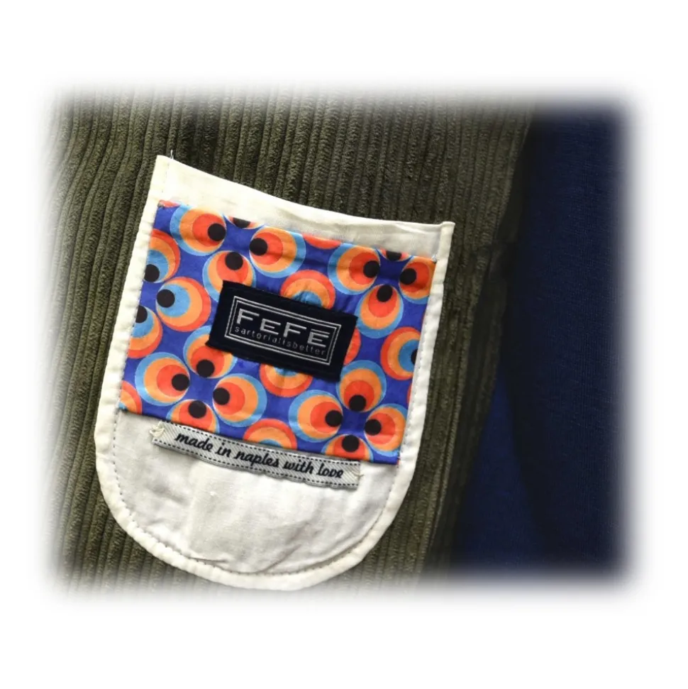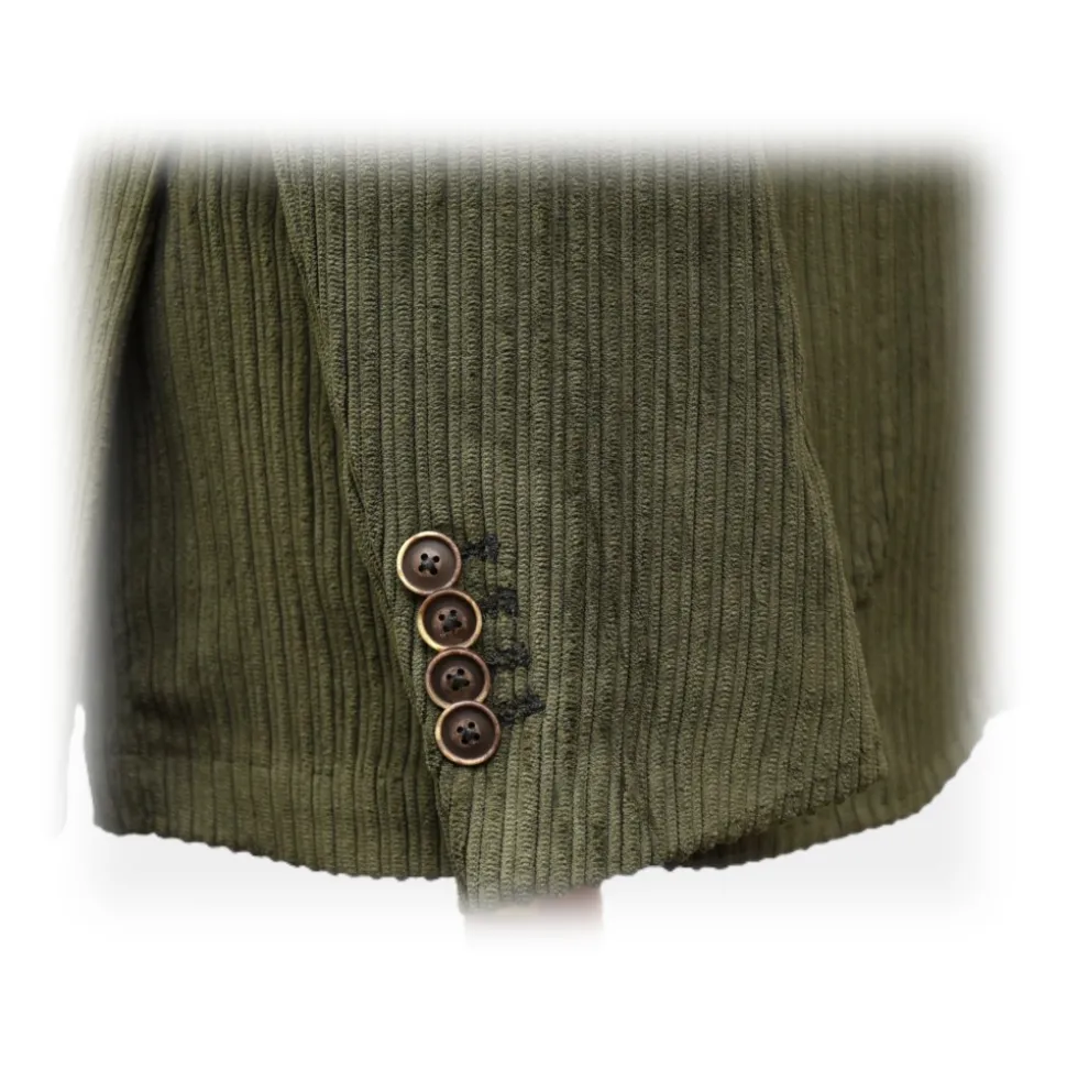 Velvet rib alternating from 0.3 to 0.5 cm. Warm, soft, comfortable, resistant fabric with an incredible ability to hold and refresh the light, creating an authentic play of chiaroscuro. 8cm lapel, two-button closure in mother-of-pearl, deconstructed. The cut is Neapolitan sartorial, perfect for those who love elegance but with a vintage and very refined soul at the same time.