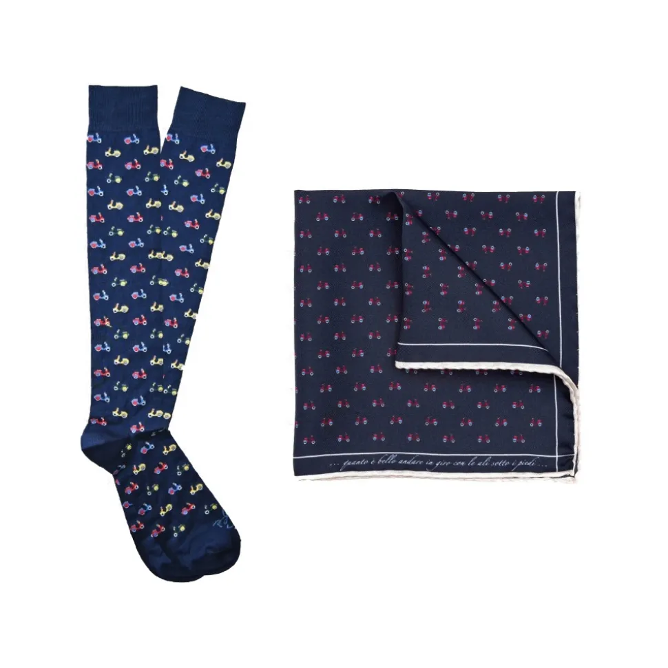 The Gift Box is the perfect gift idea: precious 100% silk pocket square entirely Made in Italy with hand-finished hem and contrasting edge coordinated with the 100% cotton long socks.