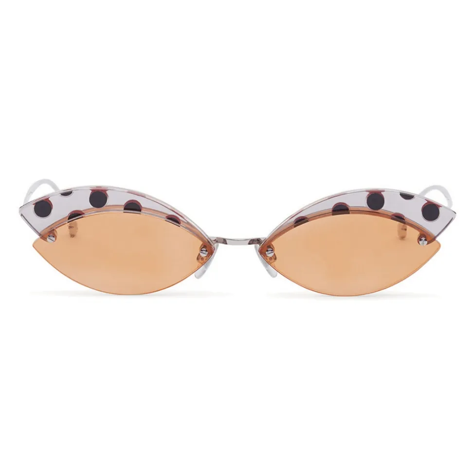 DeFender sunglasses with an innovative butterfly design. The front features flat and ciliate lenses in optyl with a red and black polka dot pattern. The metal rods with silver finish are completed by the Fendi lettering and round end in the shape of the F is Fendi logo. Orange lenses. Made in Italy.