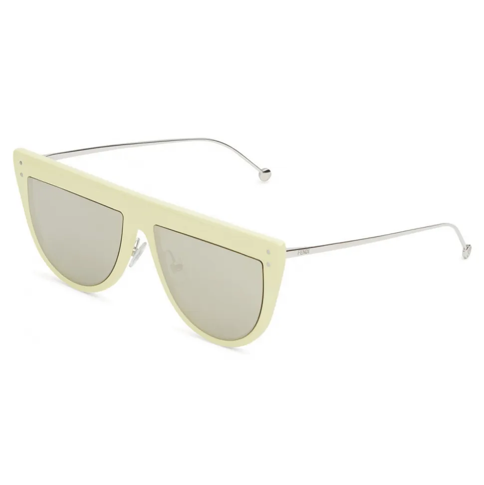 DeFender sunglasses with an oversized aviator shape featuring an innovative flat-top design. The front is made of yellow optyl and the thin metal temples with gold finish, complemented by the Fendi lettering and round terminals in the shape of the F is Fendi logo. Adjustable nose pads. Flat lenses with gold mirror effect. Made in Italy.