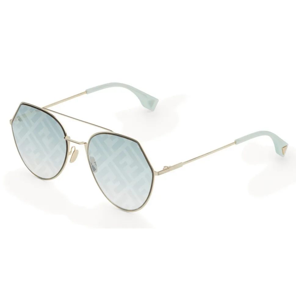 Aviator-shaped sunglasses in gold-colored metal, complemented by thin temples and opal-green terminals. Faded green lenses with gold mirrored print of the FF logo. Adjustable nose pads. Made in Italy.