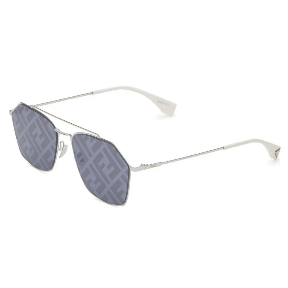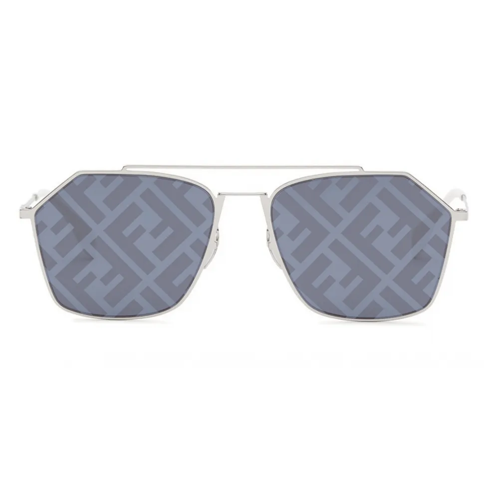 Eyeline sunglasses characterized by a flat and minimal design, with iconic details and color contrasts that give a graphic touch. The lightweight frame is made of metal with palladium finish. The rectangular shape has a double bridge with a contrasting painted edge and thin temples. Engraved Fendi logo and custom white terminals with the iconic triangle. Adjustable nose pads. Gray lenses decorated with silver FF cliché print. Made in Italy.