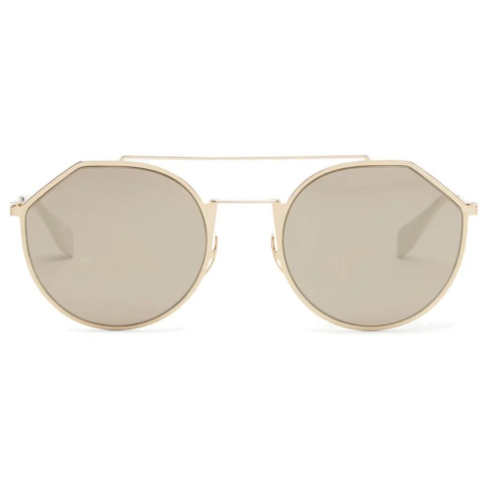Eyeline sunglasses characterized by a flat and minimal design, with iconic details and color contrasts that give a graphic touch. The frame has a rounded pilot shape, made of metal with golden finish. Double bridge with contrast painted border and adjustable nose pads for maximum comfort. The thin temples are completed by white terminals, personalized with the iconic triangle. Fendi logo engraved. Lenses with mirrored gold effect.