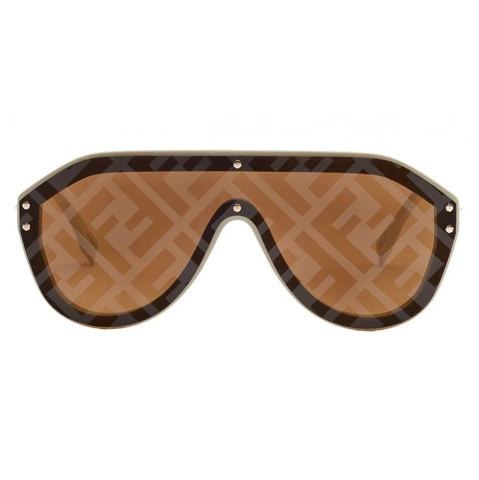 Fendi Fabulous shield sunglasses. The design is a blend of innovative sporty lines and the best craftsmanship, graphics and colours. The rubber-texture black frame is matched with gold-finish metal temples and white rubberised temple tips. The single brown lens is decorated with a cliché print of the iconic FF motif with yellow mirror effect. Laser-engraved Fendi logo on the temple.