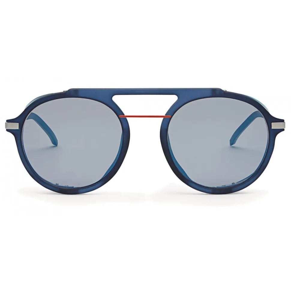 Fendi Fantastic sunglasses with a sporty and dynamic design, in perfect harmony with the mood of the collection. The round shape aviator frame is made of blue satin optyl, with an orange metal bridge. The transparent blue acetate side spoilers complete the game of contrasting colors and textures, adding a modern and distinctive touch. Triangular metal rods with rubberised terminals and engraved Fendi logo. Gray lenses.