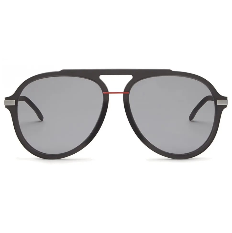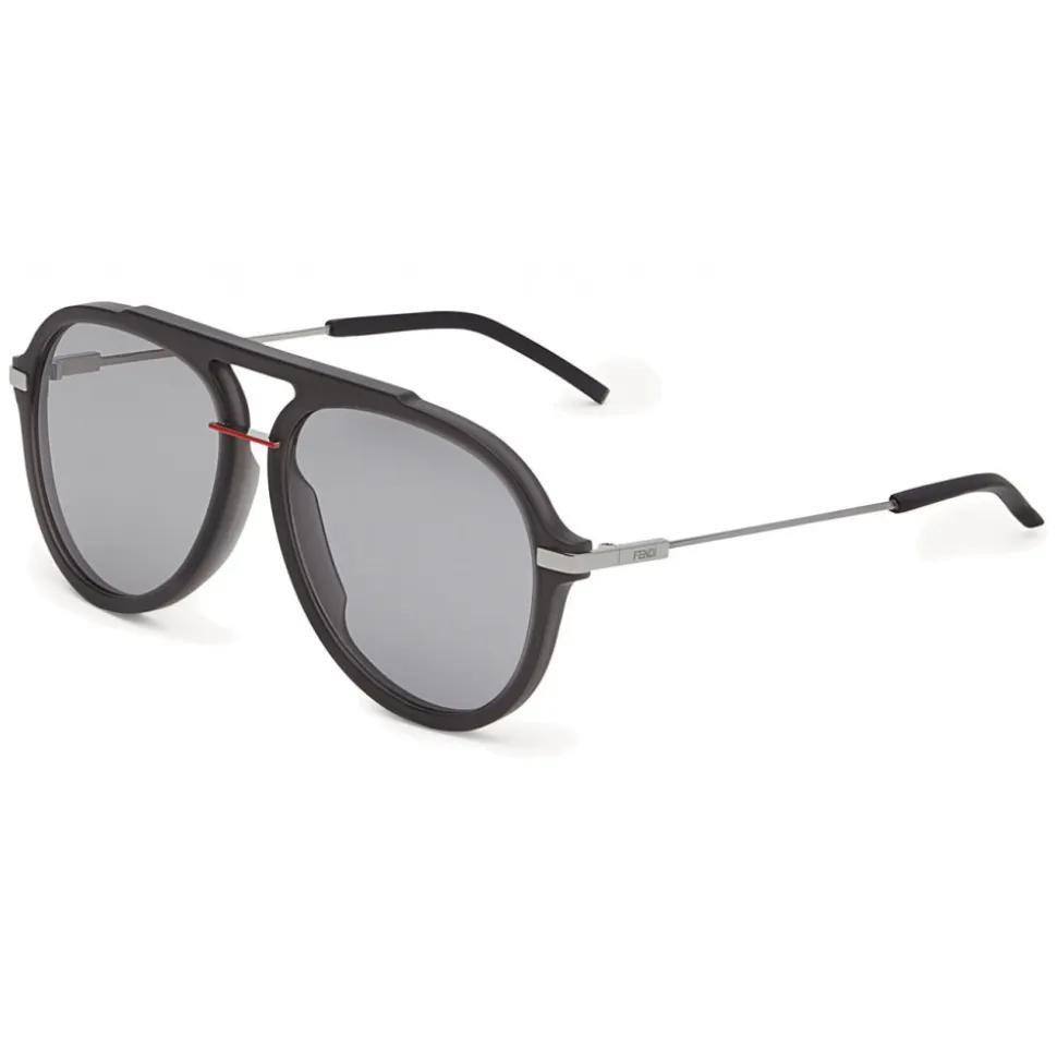 Fendi Fantastic sunglasses with an oversized aviator shape, interpreted in a mix of sporty textures and pop colors. The frame is in optyl black satin, slightly transparent, with a red metal bridge that creates a distinctive color block effect. Thin triangular metal rods with ruthenium finish, complemented by rubberised terminals and engraved Fendi logo. Gray lenses.