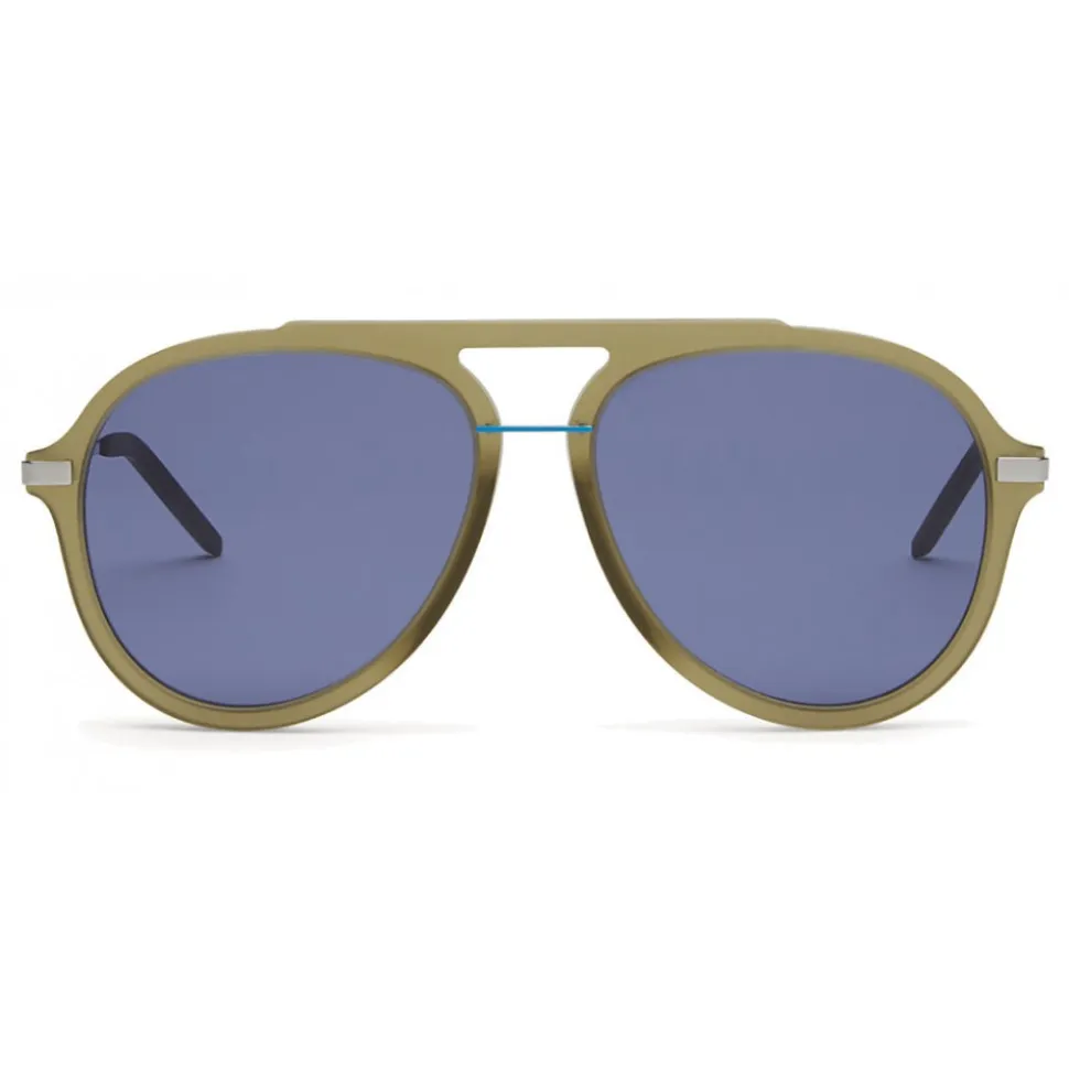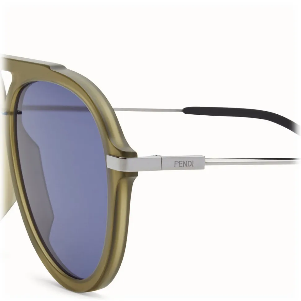 Fendi Fantastic sunglasses with an oversized aviator shape, interpreted in a mix of sporty textures and pop colors. The frame is in optyl satin green equator, slightly transparent, with a turquoise metal bridge that creates a distinctive color block effect. Thin triangular metal rods with ruthenium finish, complemented by rubberised terminals and engraved Fendi logo. Blue lenses.