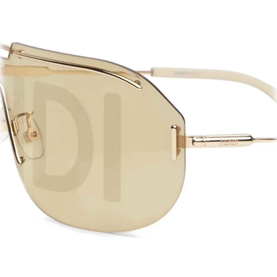 These shield glasses, presented in the 2020 Autumn/Winter fashion show, feature a characteristic, ultra-lightweight design. Bridge and slender branded temples in gold-colored metal with matte white tips. Brown lenses with gold mirror-effect and Fendi logo. Adjustable nose pads. Made in Italy.