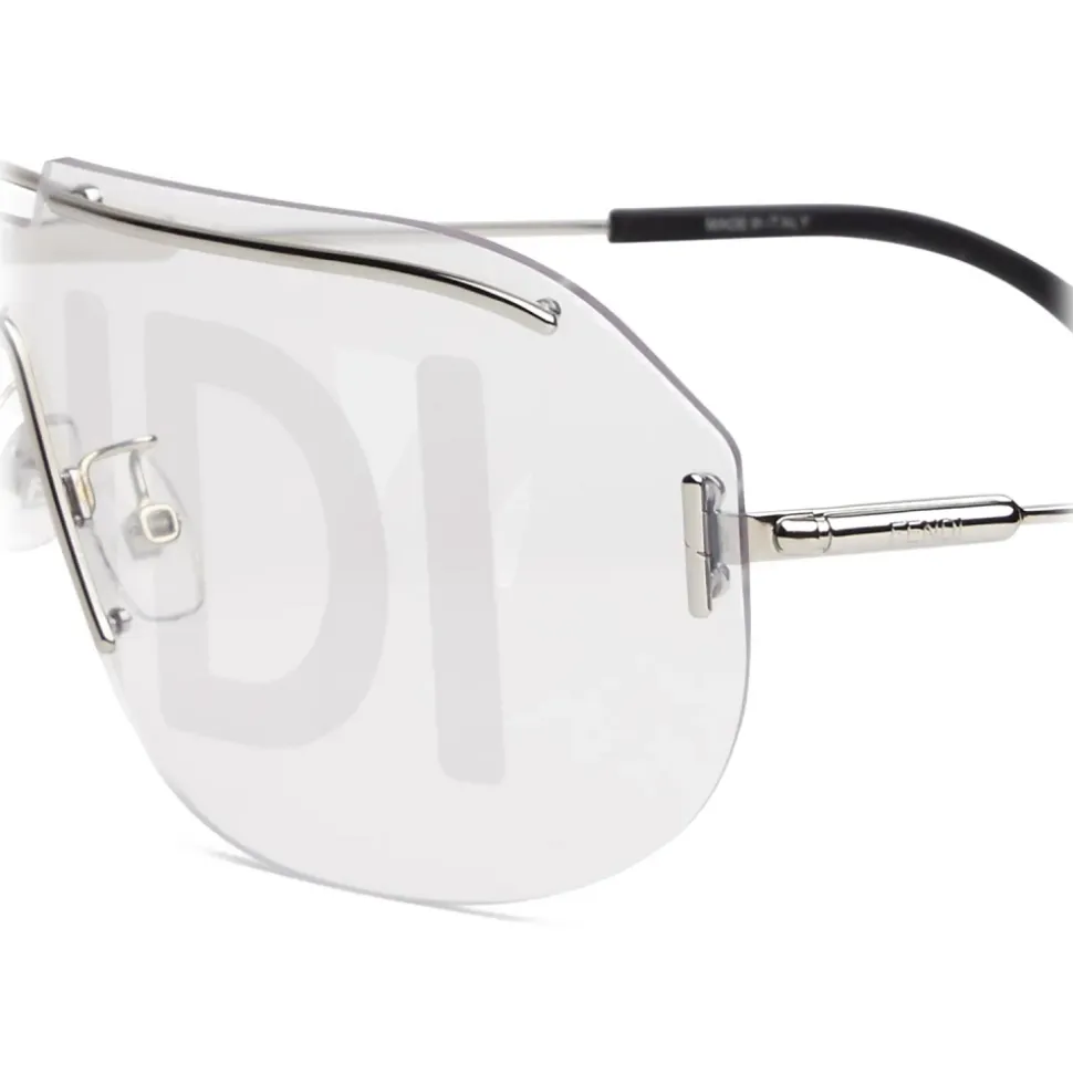 These shield glasses, presented in the 2020 Autumn/Winter fashion show, feature a characteristic, ultra-lightweight design. Bridge and slender branded temples in palladium-color metal with matte yellow tips. Gray mirror-effect silver lenses with Fendi logo. Adjustable nose pads. Made in Italy.