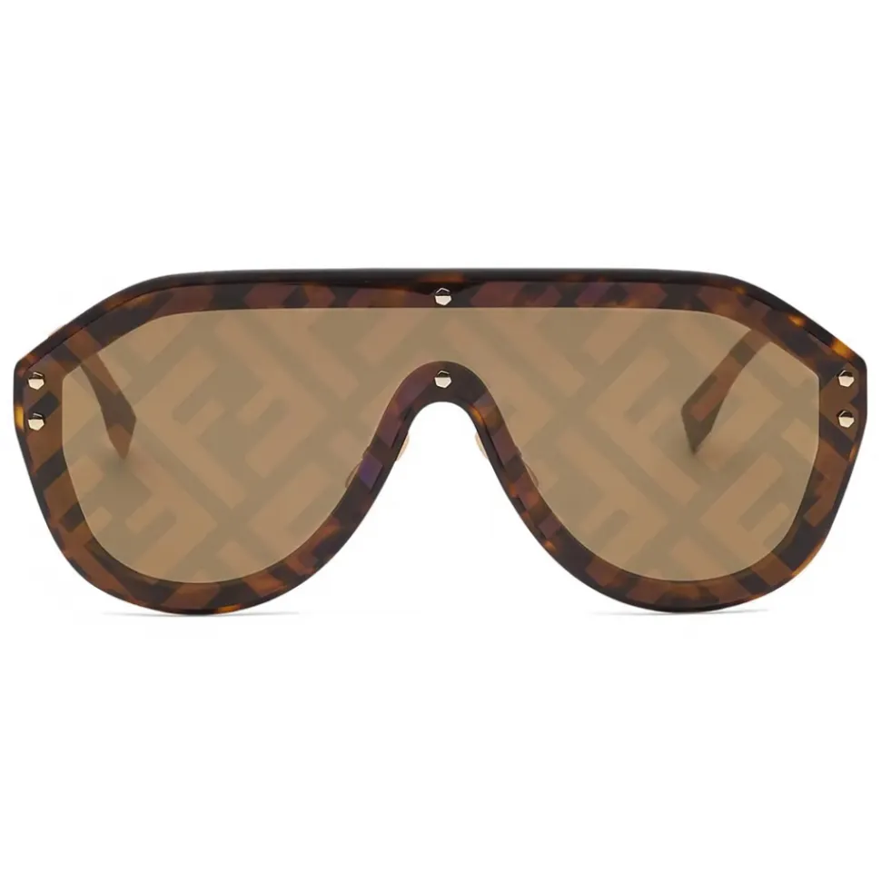 Injection-moulded shield style in brown with a rubber texture, gold-color metal temples and matte beige tips. The brown single lens is decorated with a gold mirror-effect FF logo print. Adjustable nose pads. Made in Italy.