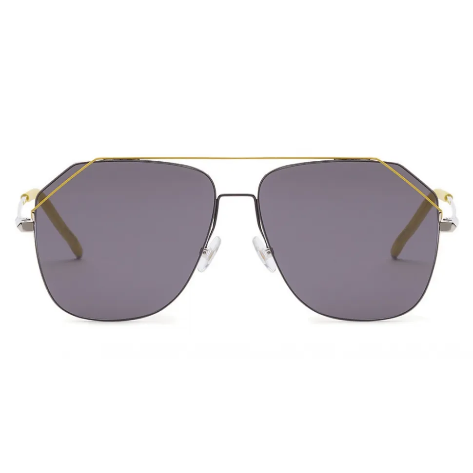 FendiFiend sunglasses with caravan shape, made of metal with gold finish. The model is characterized by a “UFO” construction, a yellow metal wire that frames the lenses creating an unusual geometric effect. Triangular custom temples with engraved Fendi logo and yellow terminals. Thin bridge and adjustable nose pads. Gray lenses. Made in Italy.