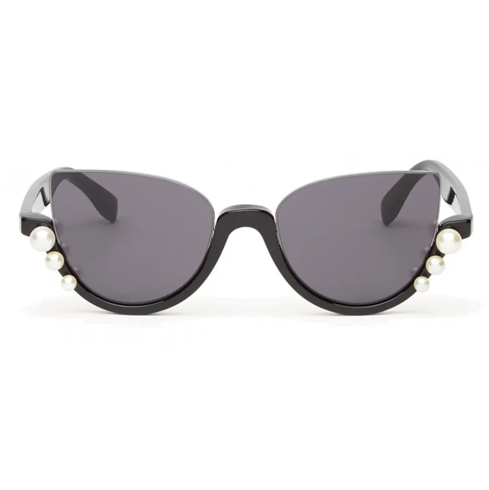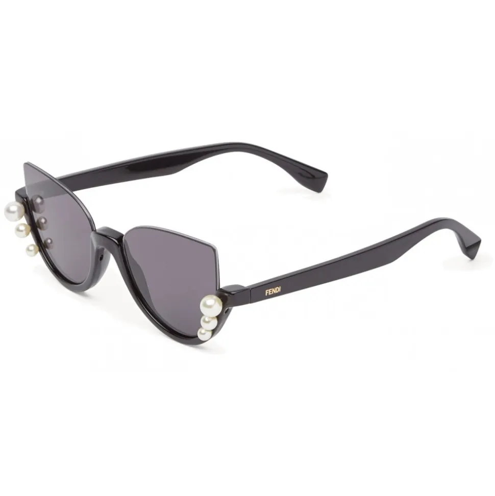 Ribbons and Pearls sunglasses that incorporate the cut of the iconic “Blink” shape, with a black acetate frame. The Swarovski pearls applied on the front in three different sizes embellish the innovative and feminine design of the model. Fendi logo engraved. Gray gradient lenses.