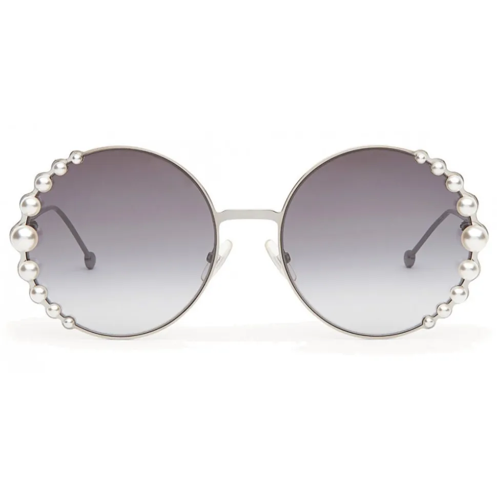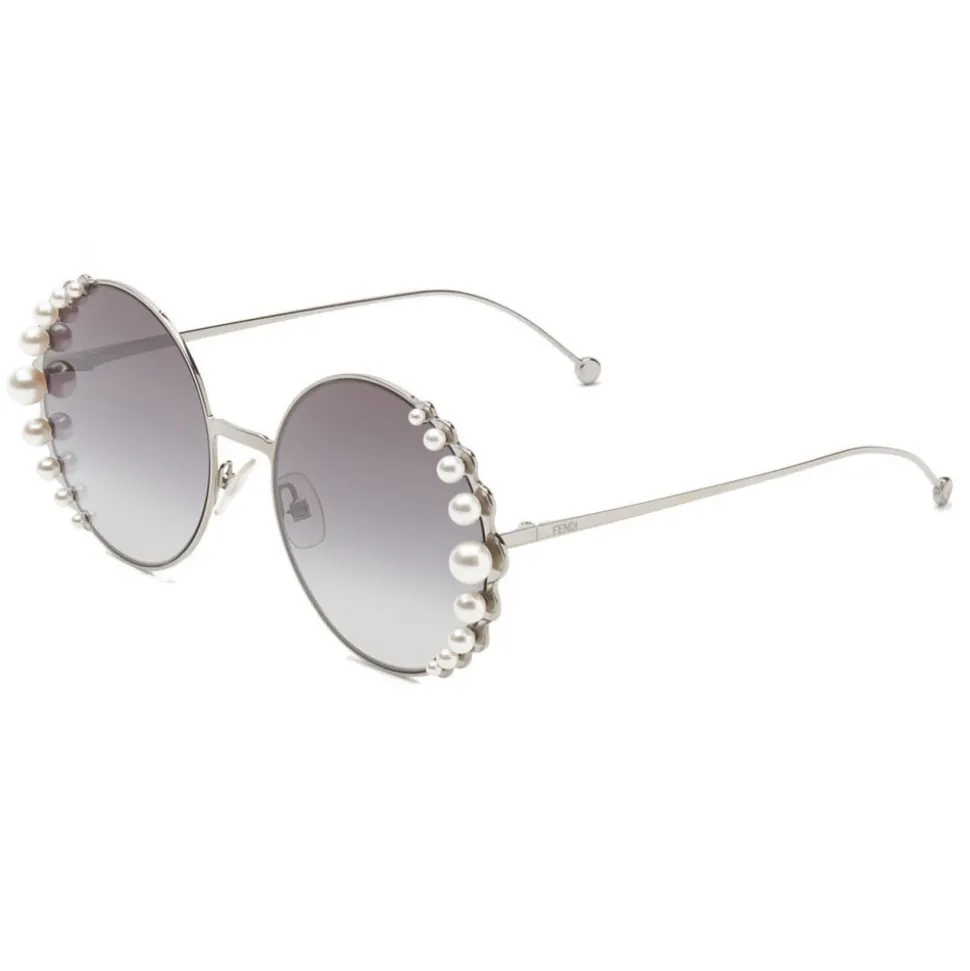 Ribbons and Pearls sunglasses with an oversized round shape. The metal frame with dark ruthenium finish is light and hyperfeminine, embellished with Swarovski pearls in different sizes. The thin temples are personalized with the Fendi logo engraved, the new Fendi logo is shown on the terminals. Gray gradient lenses.