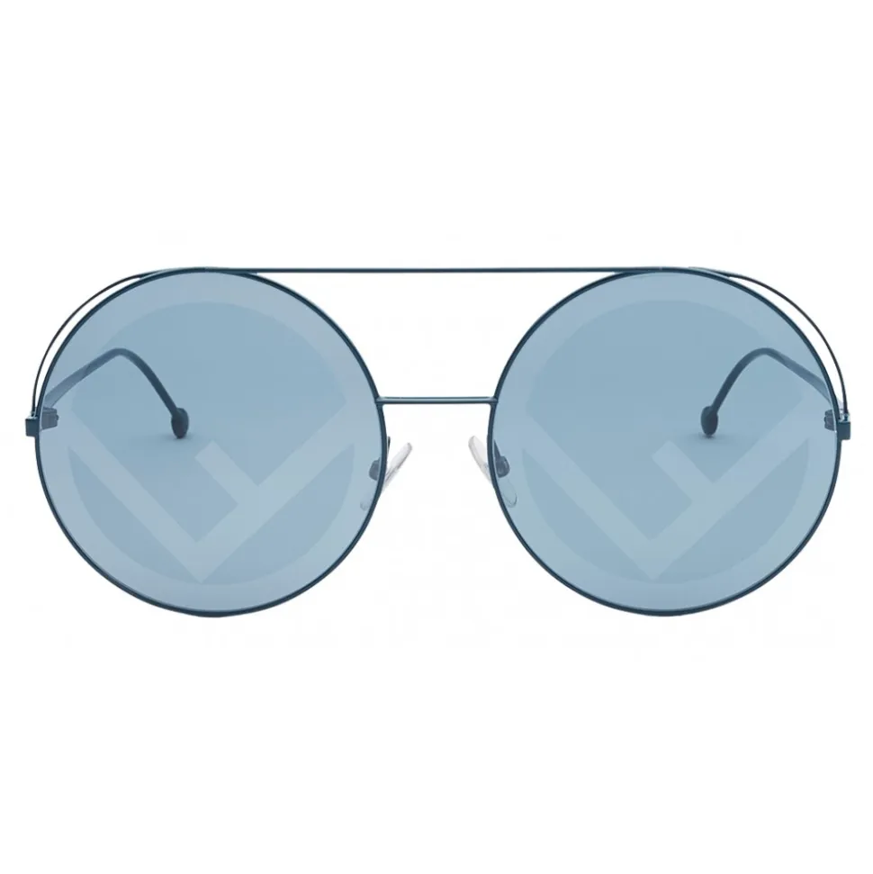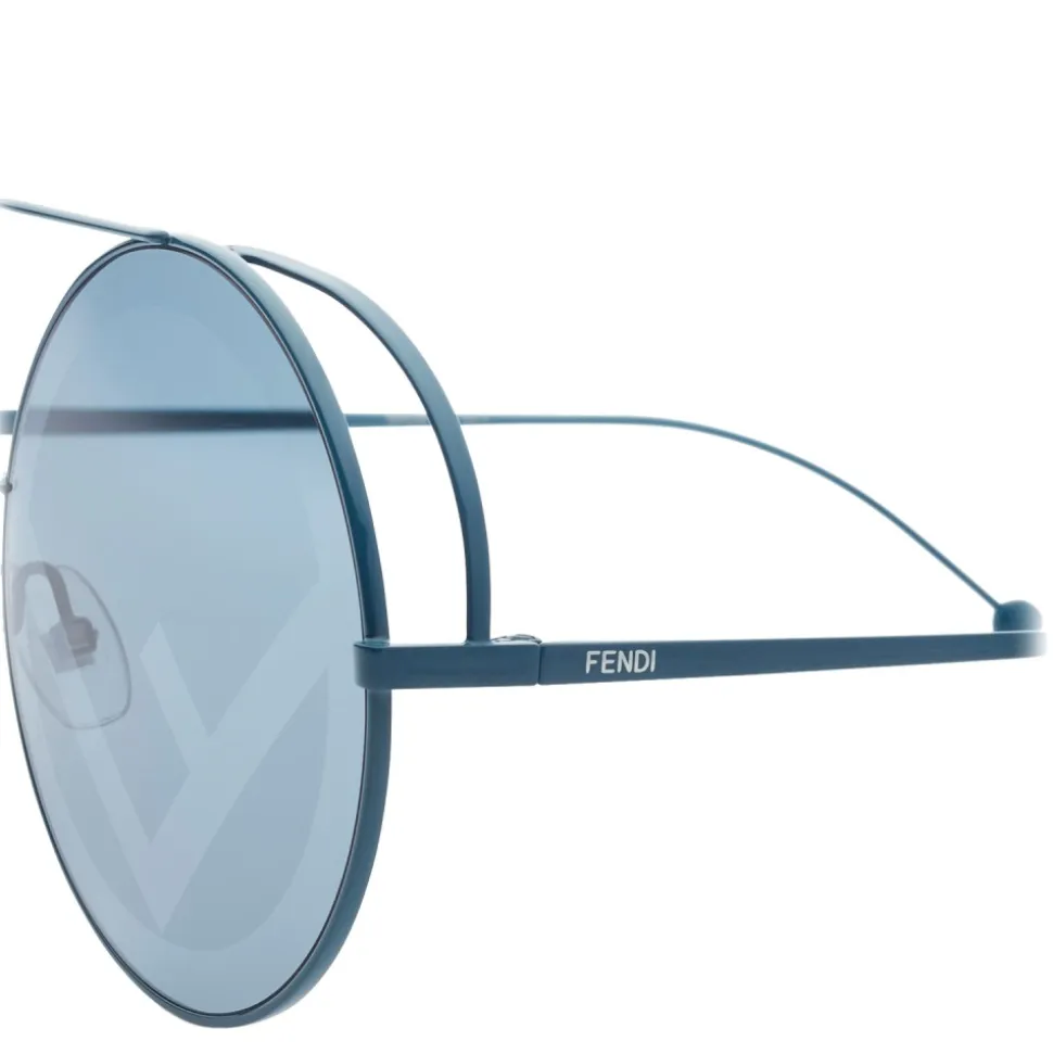 Run Away oversized sunglasses with oil green painted metal frame, double bridge and thin spoilers that emphasize the rounded design structure. The lens decorated with cliché print reproduces with a silver-mirrored effect the new Fendi logo, also shown on the terminals. Lenses and frames of the same color to underline the tone-on-tone look.
