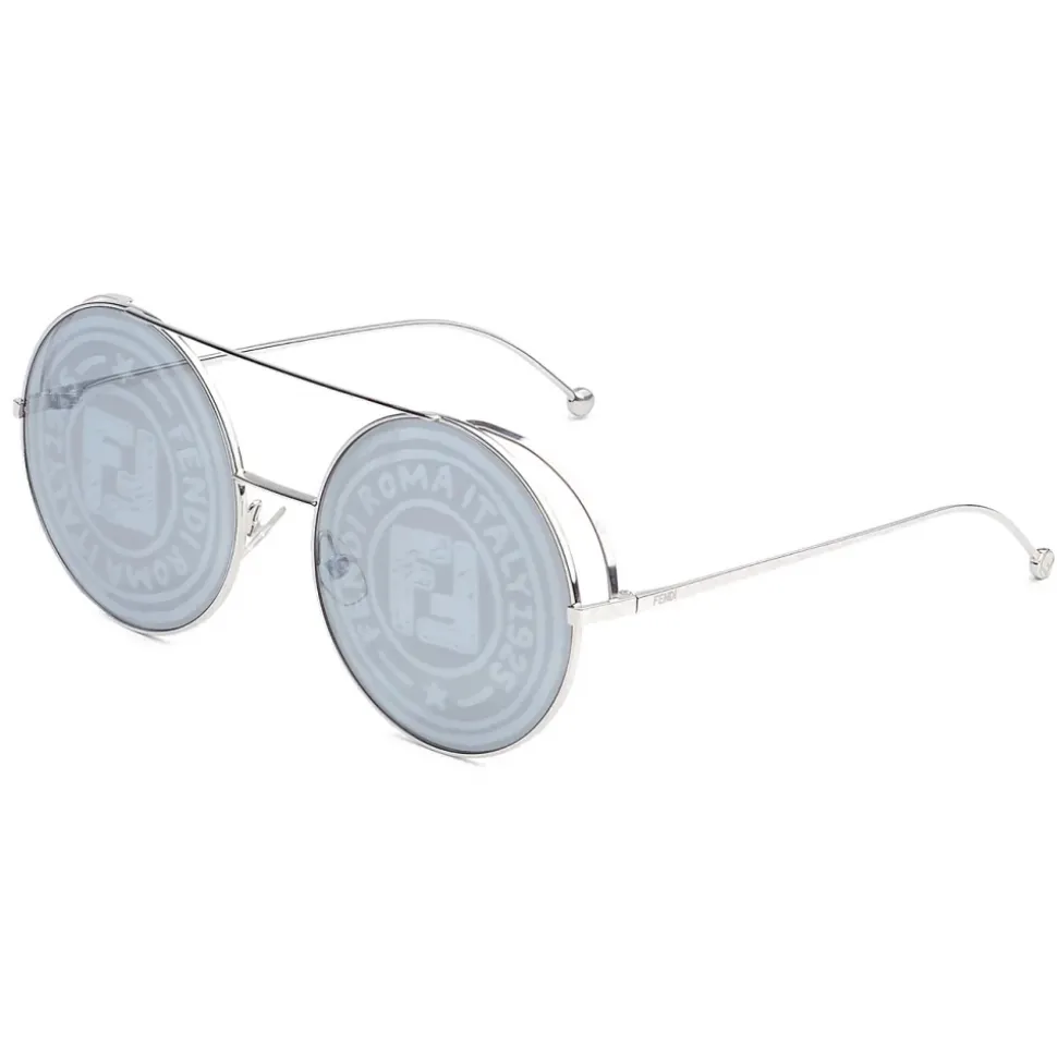 Round oversized sunglasses with palladium-color metal mount. Gray lenses with silver mirror-effect Fendi Roma stamp. Adjustable nose pads. Made in Italy.
