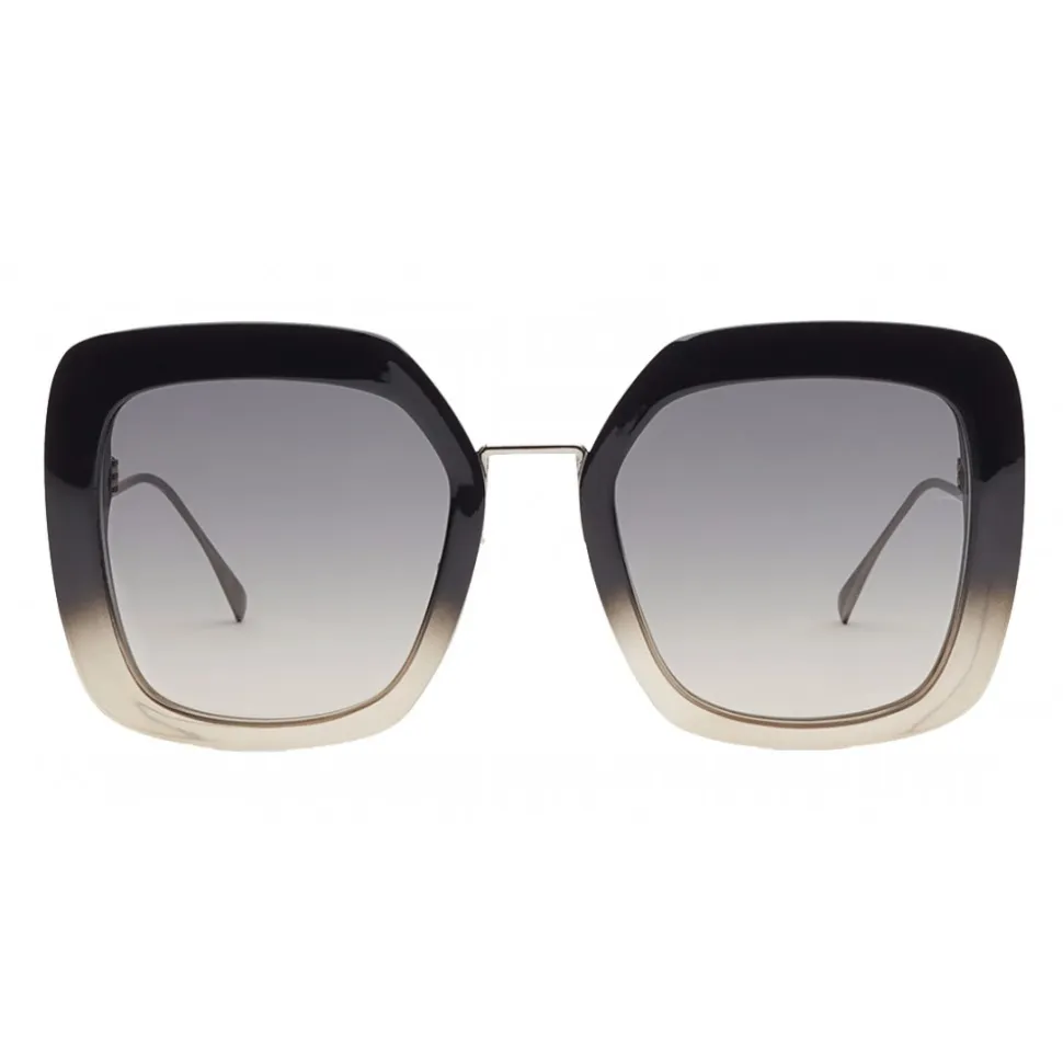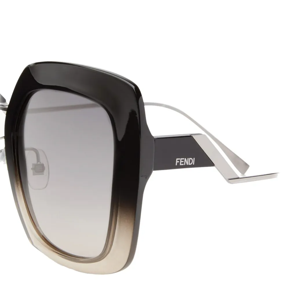 Tropical Shine sunglasses with an oversized squared shape. The model has adjustable nose pads and metal rods with an iconic angled shape. Made of acetate with a dégradé effect in shades of black and gray. The metal rods with ruthenium finish are enriched by a black color block detail and personalized with the silver Fendi logo. Gray gradient lenses.