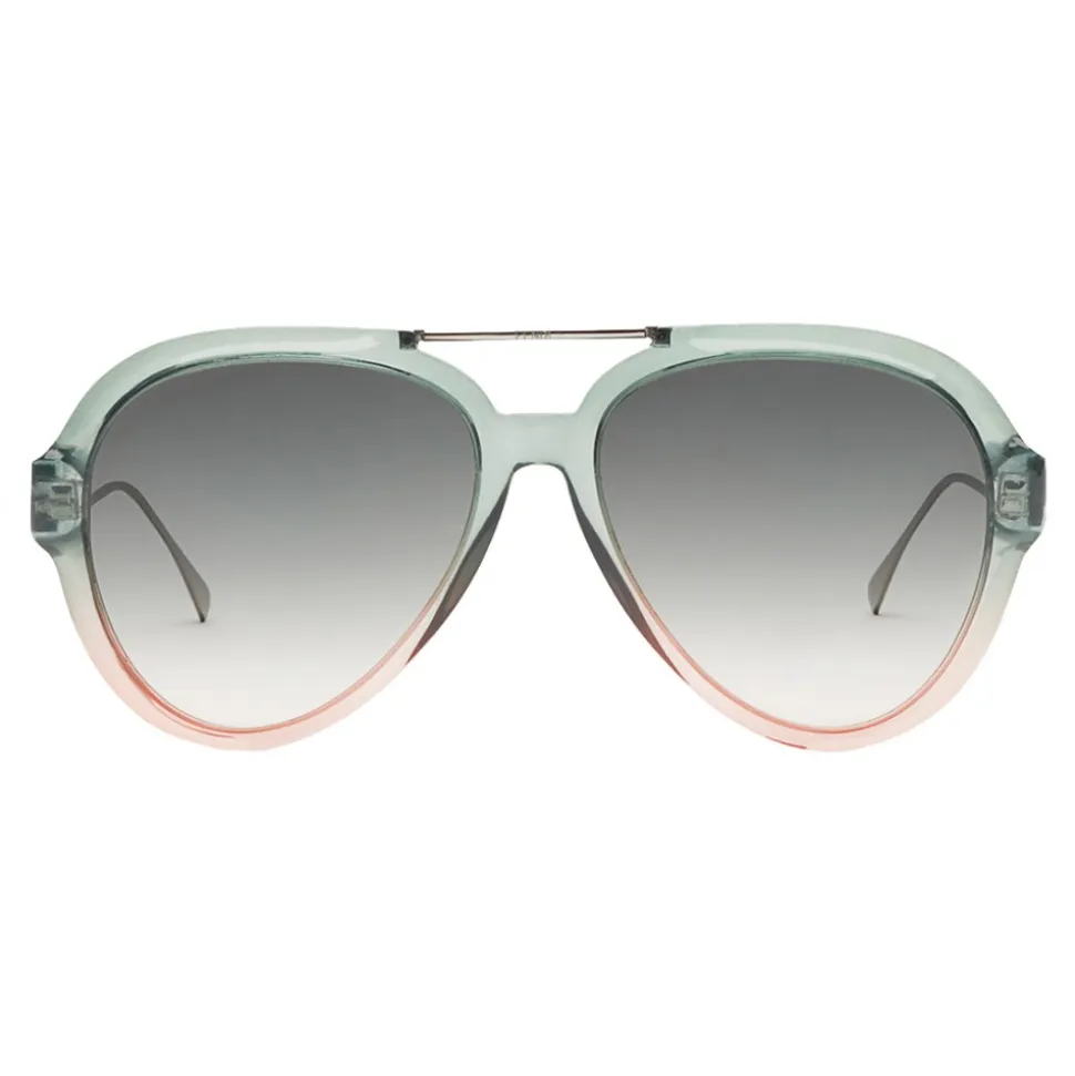 Tropical Shine sunglasses with an oversized aviator shape. The model has a double bridge and metal rods with an iconic angled shape. Made of acetate with a dégradé effect in shades of green and pink. The metal rods with ruthenium finish are enriched by a green color block detail, personalized with the silver Fendi logo. Brown gradient lenses.