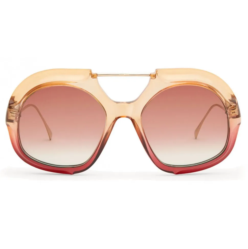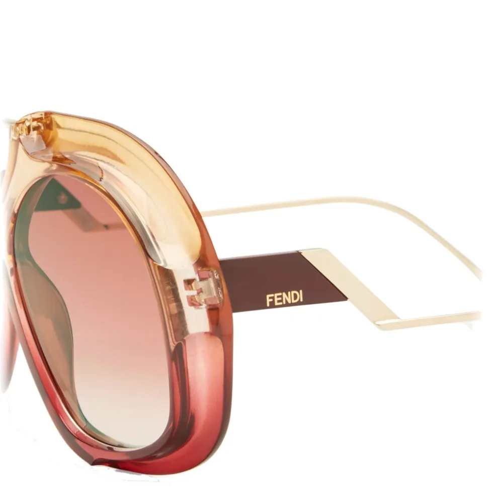 Tropical Shine sunglasses with an oversized aviator shape. The model is illuminated by a sophisticated mix of Caribbean tones, with a double bridge and metal rods with an iconic angled shape. Made of transparent acetate with a dégradé effect in shades of peach pink and red. The metal rods with golden finish are enriched by a red color block detail and personalized with the Fendi logo. Bordeaux shaded lenses.