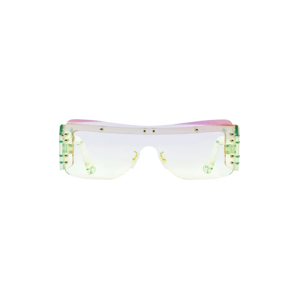 Frameless, tone-on-tone mask sunglasses. Nylon lenses in Prism color.