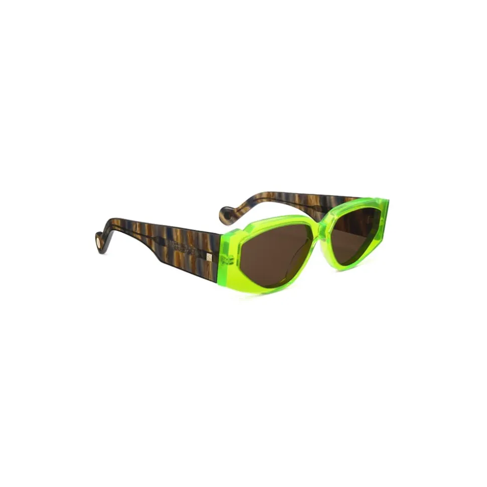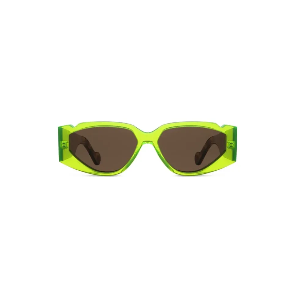 Wide rectangular sunglasses with curvy, rounded edges. Made in Acid Green acetate, with wide brown and blue-grey tortoise temples. Featuring dark brown tinted nylon lenses.