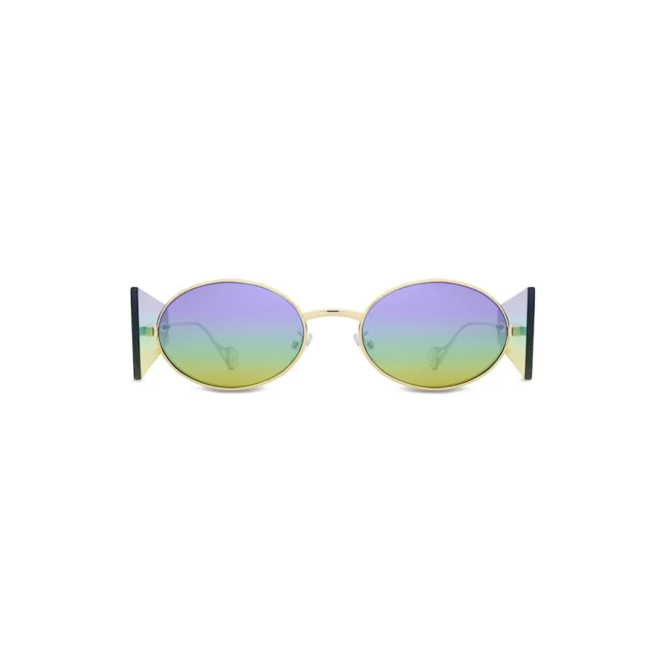 Rounded Rainbow nylon lenses with a gold-tone metallic frame. Features ornamental plates on both temples also in rainbow nylon.