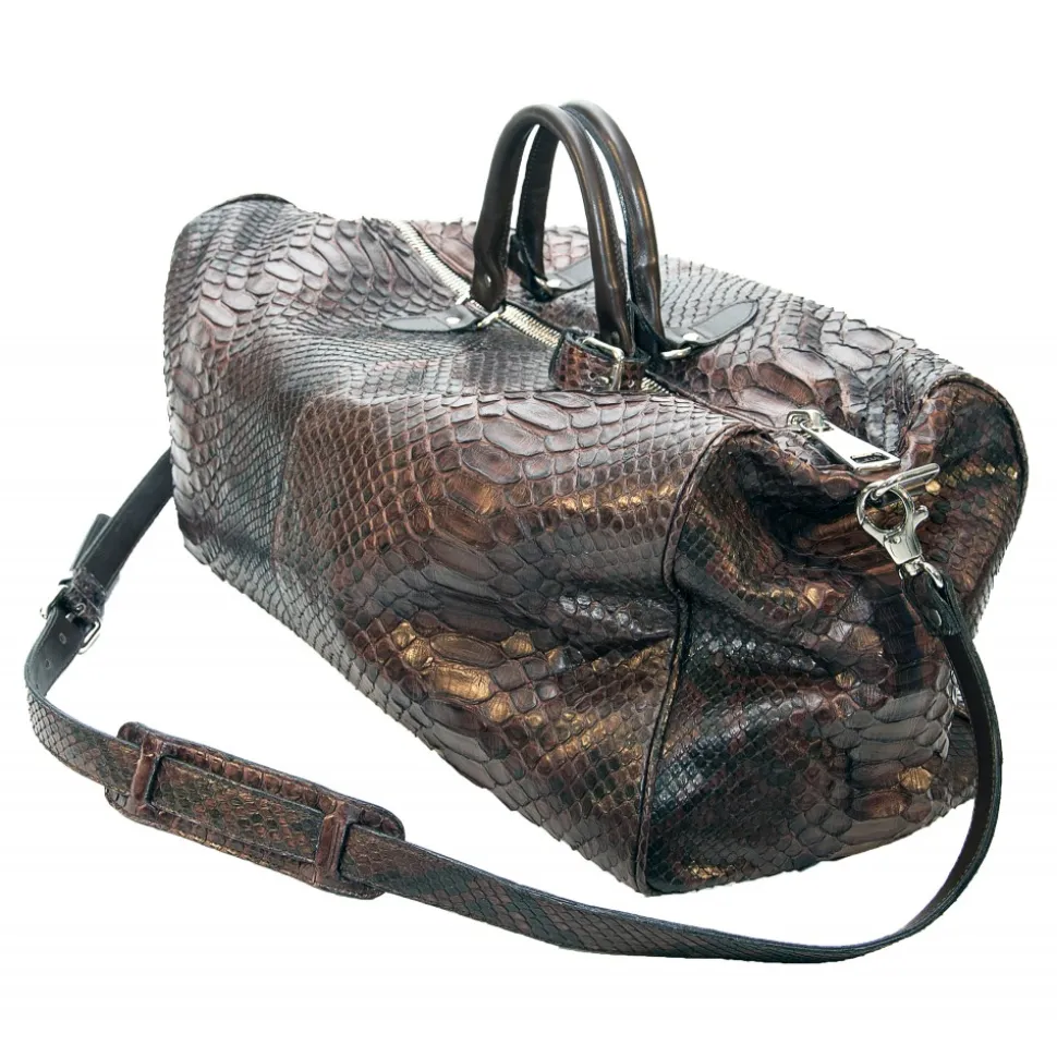 Travel bag in python leather with unisex handles. A perfect bag for every day that combines incredibly practical beauty and functionality. Also good as a travel bag or weekend.