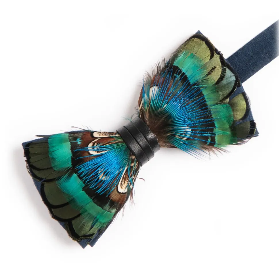 Navy Blue Suede Bowtie with Green Bronze Golden Pheasant, Lady Amherst Pheasant Green Plumage, Natural Almond Ringneck Pheasant, Iridescent Blue Peacock Feathers.