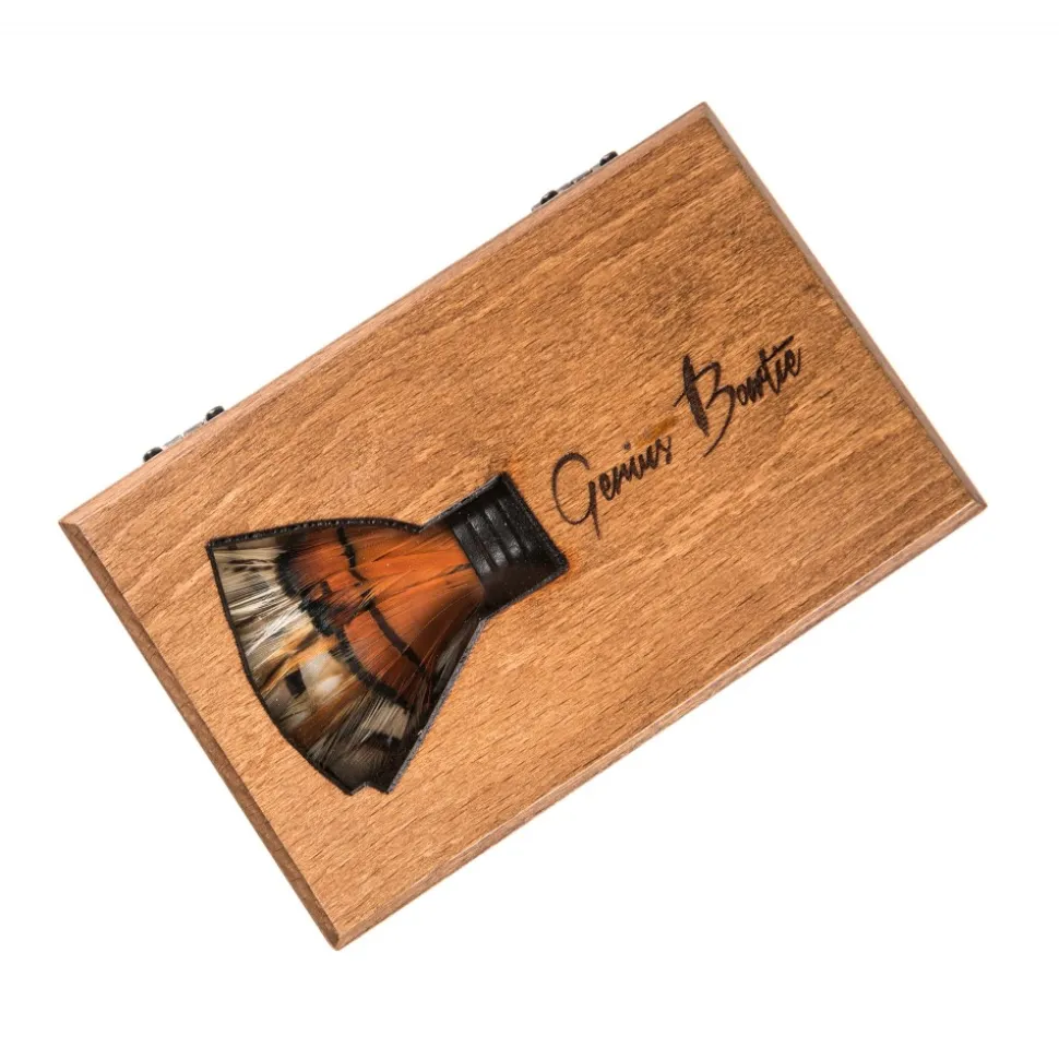 Arrives in a hand-crafted beech tree (betula pendula) wooden box. Outer packaging is natural craft paper with our logo seal. Includes an info booklet about your GeniusBowtie.