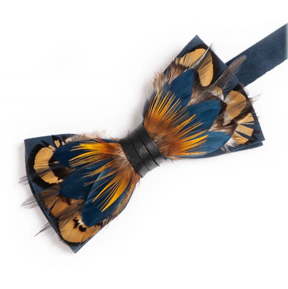 Navy Blue Suede Bowtie with Natural Gold Venery Pheasant Plumage Feather, Yellow Golden Pheasant Plumage Wholesale Feather, Navy Blue Goose, Navy Rooster Neck Hackle Feathers.