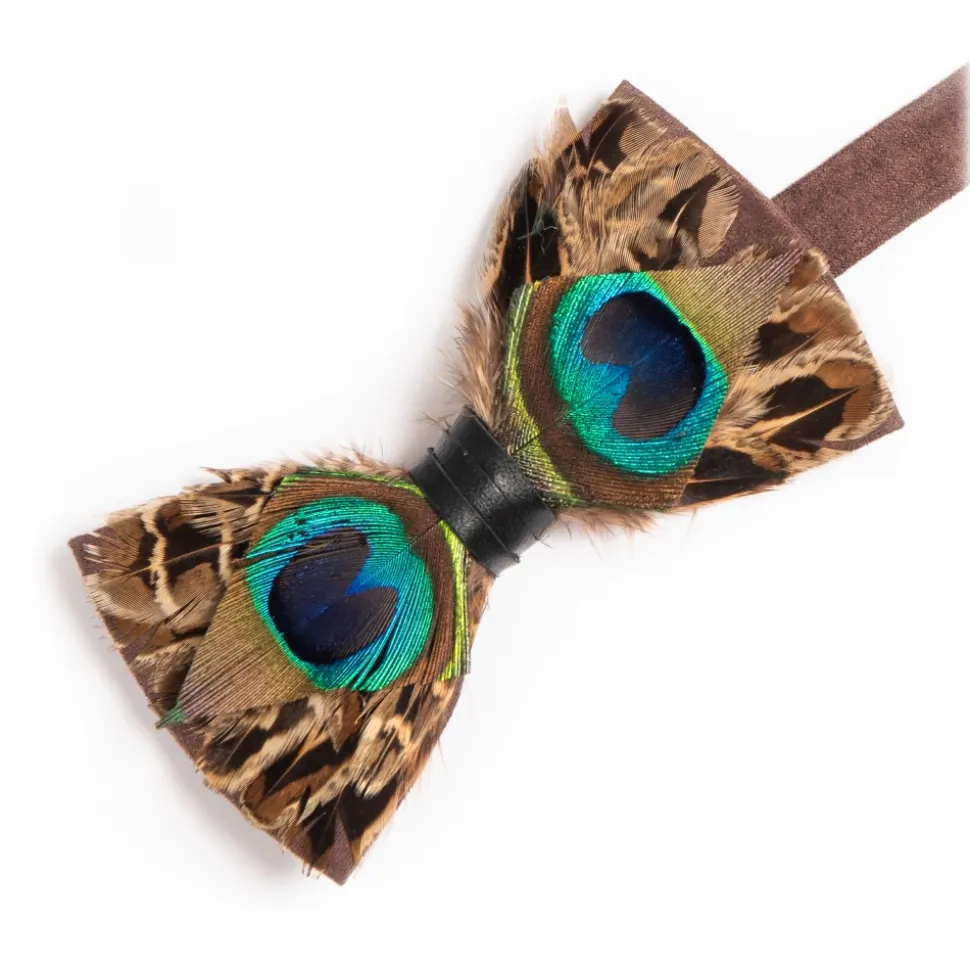 Brown Suede Bowtie with Natural Peacock Tail Eye Feathers, Natural Almond Ringneck Pheasant Feathers.