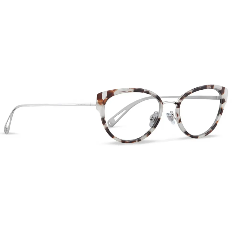 This feminine cat-eye shape celebrates the intrinsic elegance of Armani women with a shimmering color selection and polished metal undertones.