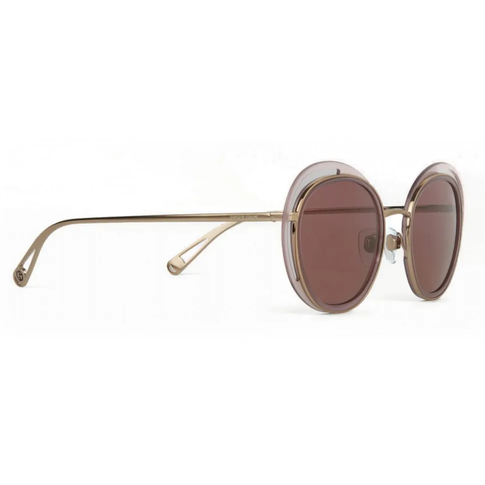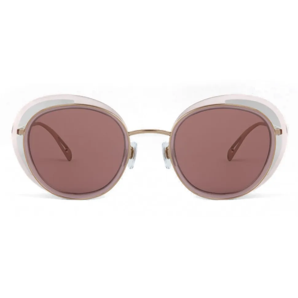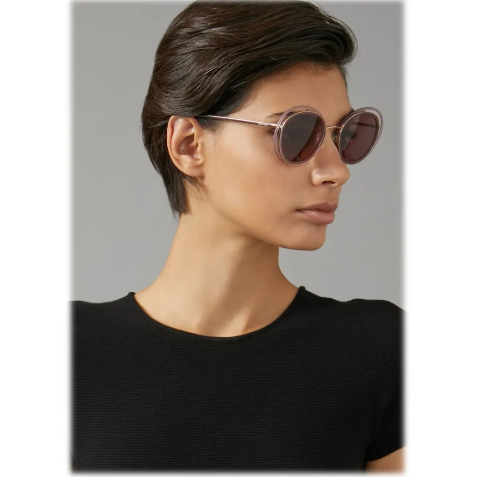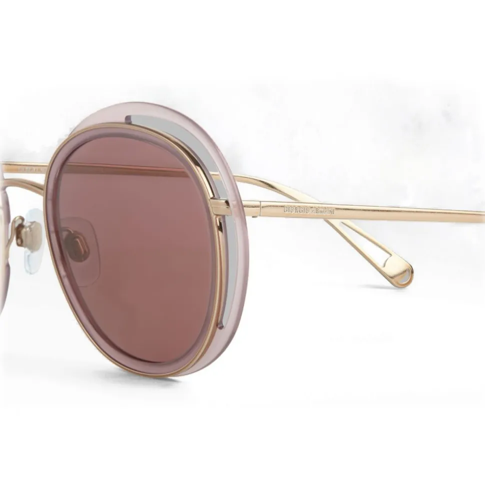 Inspired by the exclusivity of fashion signed by Giorgio Armani, the Open Lenses theme explores light and color through the structure of the frame, rigorously and at the same time expressing the quintessence of the glamor of this brand. This sunglasses model with the innovative “open” round shape has shiny metal profiles with acetate inserts. The new, very thin structure of the temples has perforated drop-shaped terminals, black enameled GA logo, iconic detail that underlines the brand’s identity, and the laser-engraved Giorgio Armani logo at the beginning of the auction, another discreet reference to the brand.