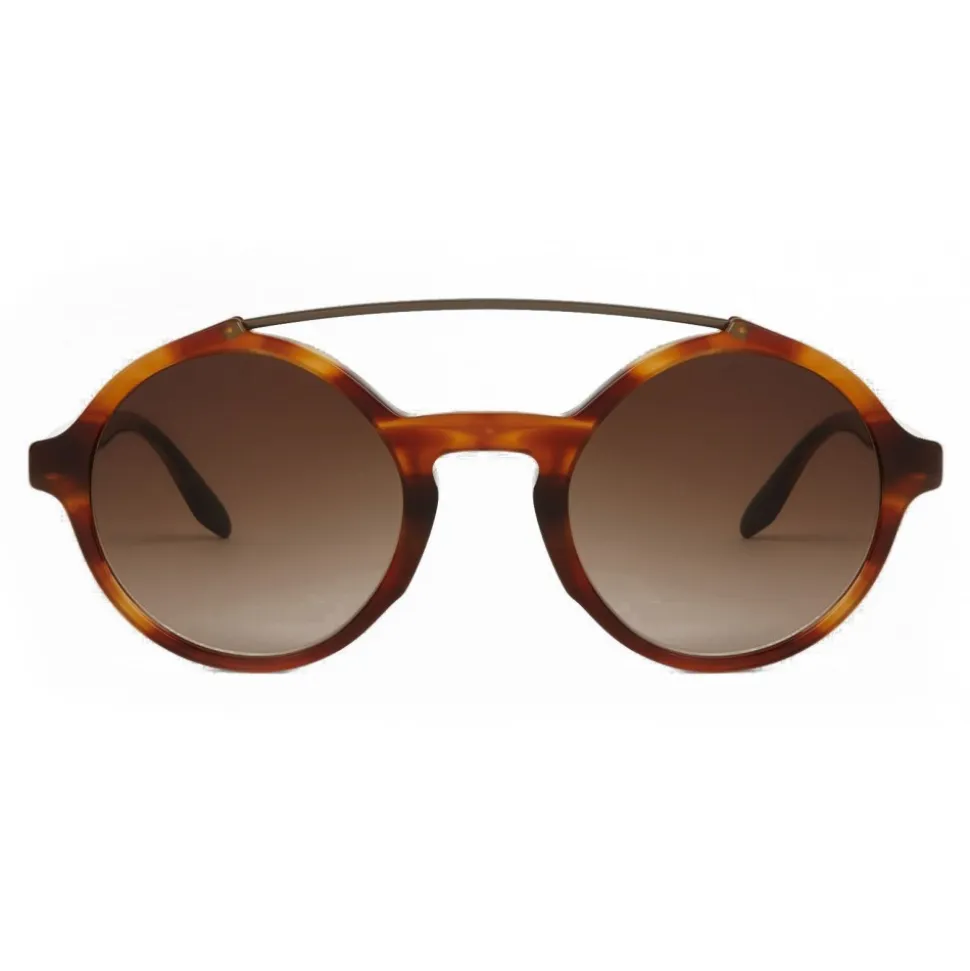 Protagonist of the catwalk and of the Fall / Winter advertising campaign, this round-shaped sun model redefines the concept of vintage charm standing out for its stylistic originality and strength of character. Going to streamline the small caliber shape, the sophisticated flat metal bar unites past and present with a rigorous elegance, while the emblematic rhomboid stem finals and the logo plaque underline the iconic identity of the brand. In contrast to the rich glossy colors of the acetate, the modern accents in opaque metal create a visual contrast that gives modern relevance to this top model and highlights the brand’s identity with discretion.