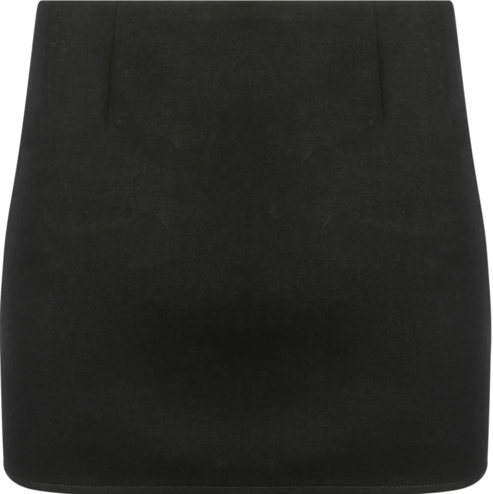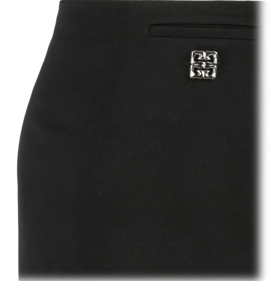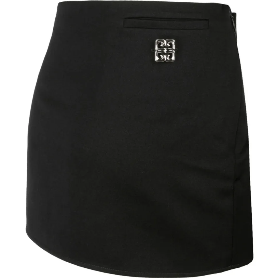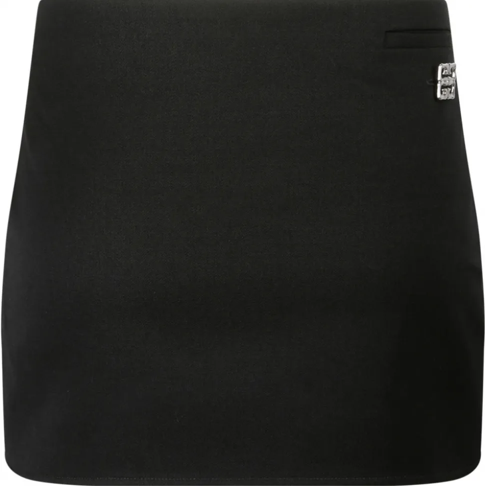 Givenchy Black 4G-Plaque Miniskirt. Black wool miniskirt, crepe texture, signature 4G silver tone plaque, low rise. Concealed side hook and zip fastening, side welt pocket, full lining, straight hem and thigh length.