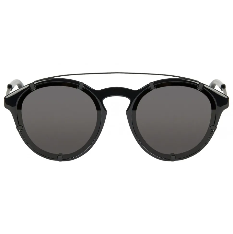 Black acetate sunglasses with bridge and opaque black metal temples and smoky gray lenses. Terminals in black acetate.