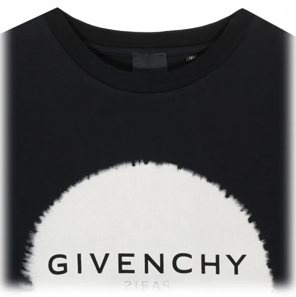 Givenchy Kids Black and White Cotton Logo Print T-Shirt. Black and white cotton t-shirt, jersey knit, spot print. Logo print to the front and to the rear, crew neck, short sleeves and straight hem.