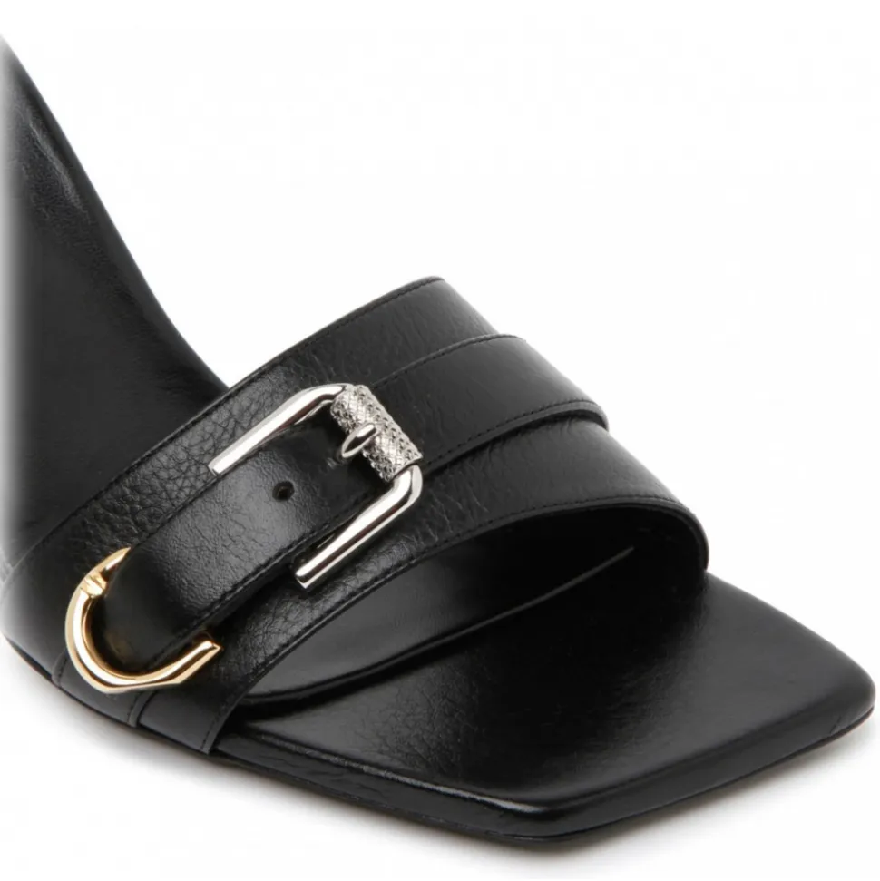 Givenchy Black Calf Leather Voyou Sandals. Black calf leather sandals, front band with strap and buckle in gold and silver metal, square toe. High and thin heel in silver metal, leather insole and sole.