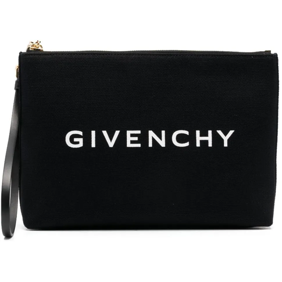 Givenchy Black Clutch Bag. Black cotton blend clutch bag, logo print to the front, internal logo stamp. Top zip fastening, wrist strap, internal slip pocket, main compartment.