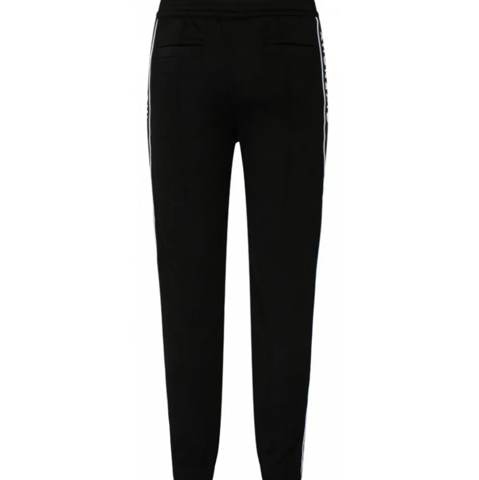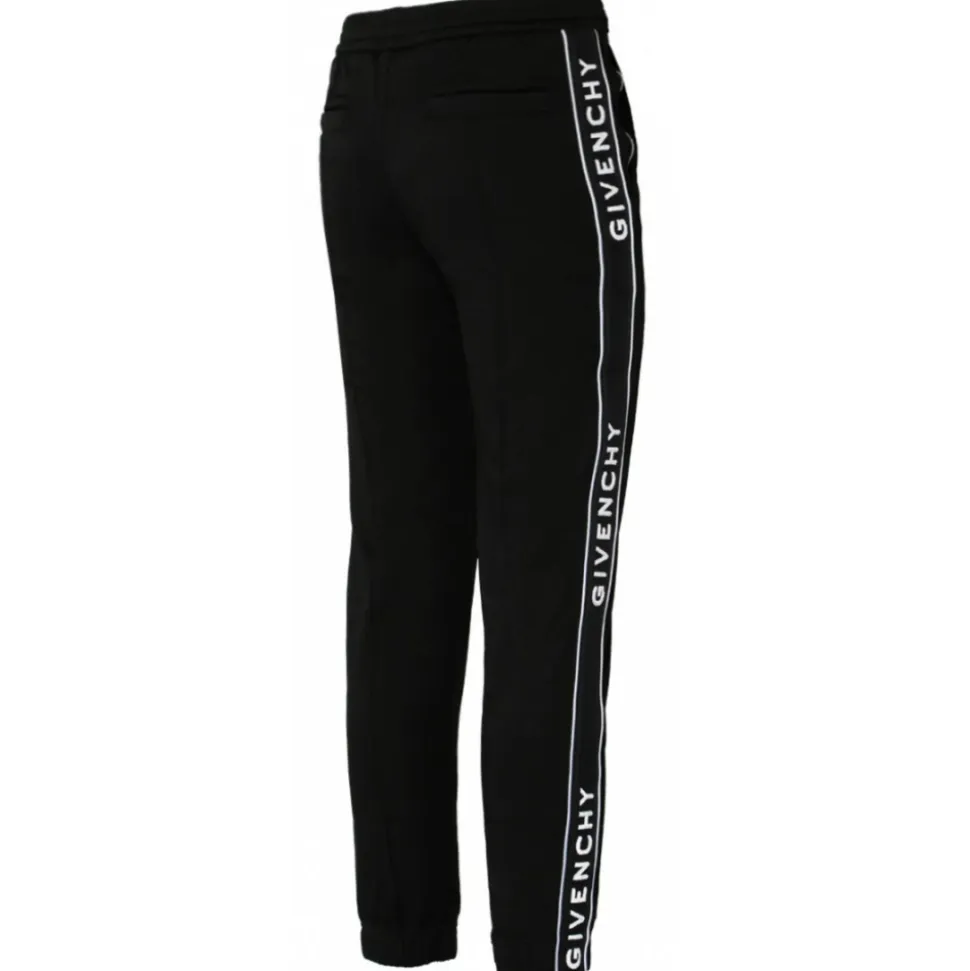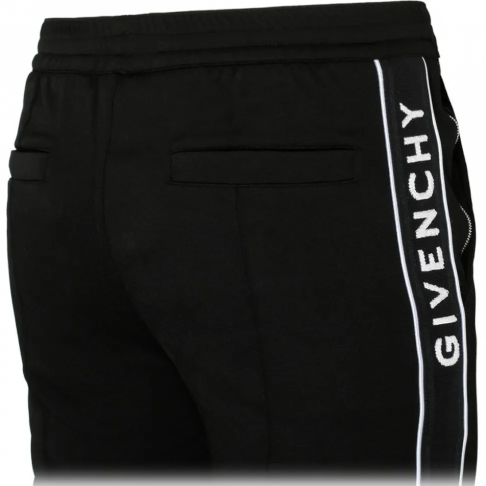 Givenchy Black Jersey Logo Bands Joggers. Black jersey joggers, logo bands along the sides, elasticated waistbands. Drawstring fastening, side zip pockets, central rib, elasticated hem.