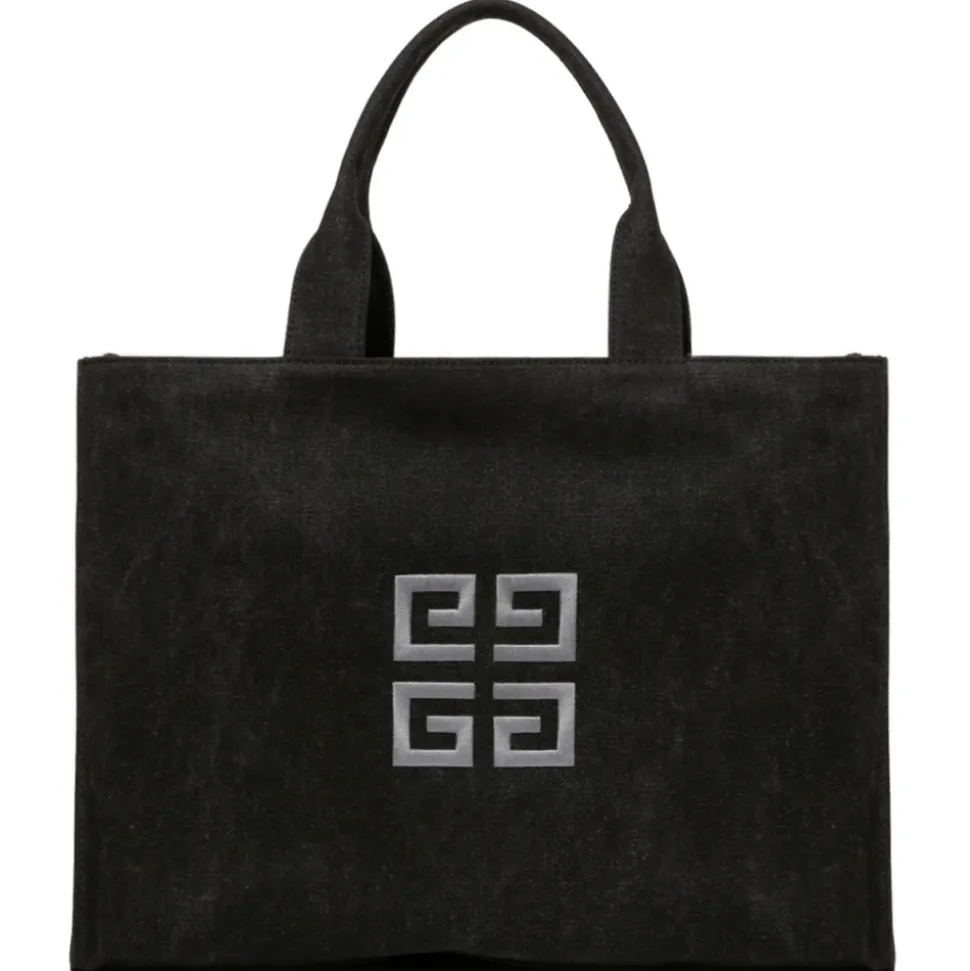Givenchy Black Logo Embroidered Tote Bag. Black cotton blend tote bag, canvas, embroidered logo to the front, signature 4G motif. Open top, flat top handles, main compartment, internal logo patch, internal slip pocket, full lining.