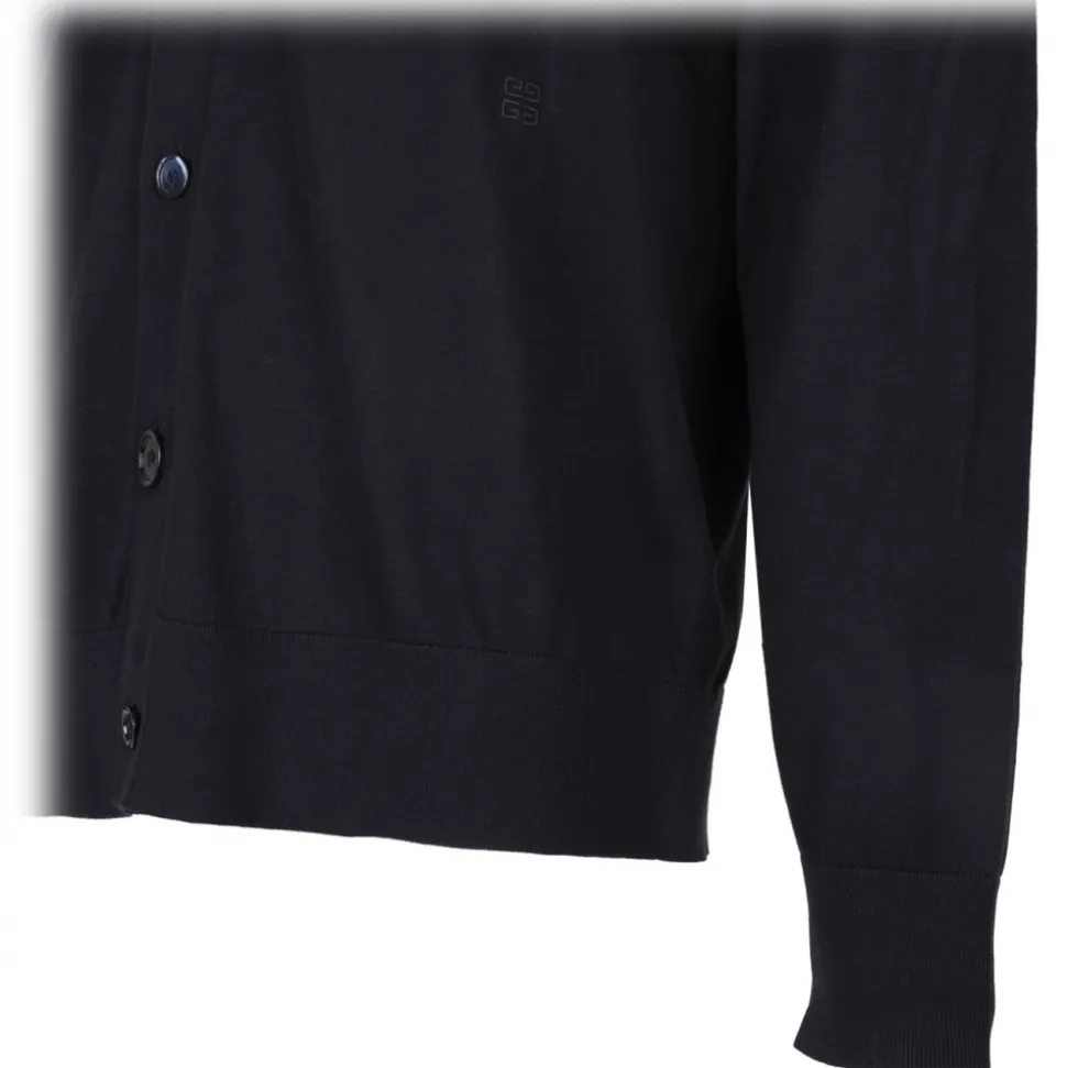 Givenchy Black Cardigan. Black long sleeved cardigan in cotton and silk. V neck, small 4G emblem embroidered on the front. Button closure, ribbed collar, hem and cuffs.