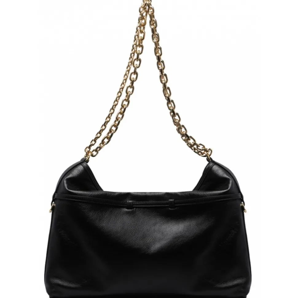 Givenchy Black Medium Voyou Shoulder Bag. Black calf leather and grained texture shoulder bag, logo stamp to the front. Decorative buckled strap detailing, D ring findings, slouchy folded top, adjustable chain link shoulder strap. Flat base, full lining, internal logo stamp. Internal zip fastening pocket, main compartment, gold tone hardware.