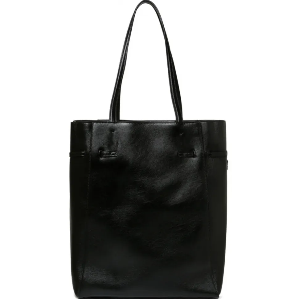 Givenchy Black Medium Voyou Tote Bag. Black calf leather tote bag, smooth grain, two flat top handles. Logo stamp to the front, adjustable belt detail, main compartment. Suede lining, mixed metal hardware, open top.