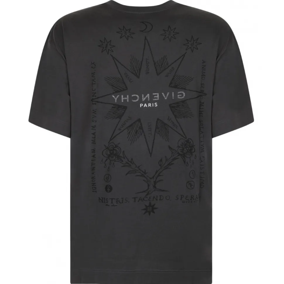 Givenchy Rosewood T-Shirt. Rosewood cotton t-shirt, short sleeves, choker. GIVENCHY Paris signature with inverted effect printed on the front and back. Tarot print on front and back.