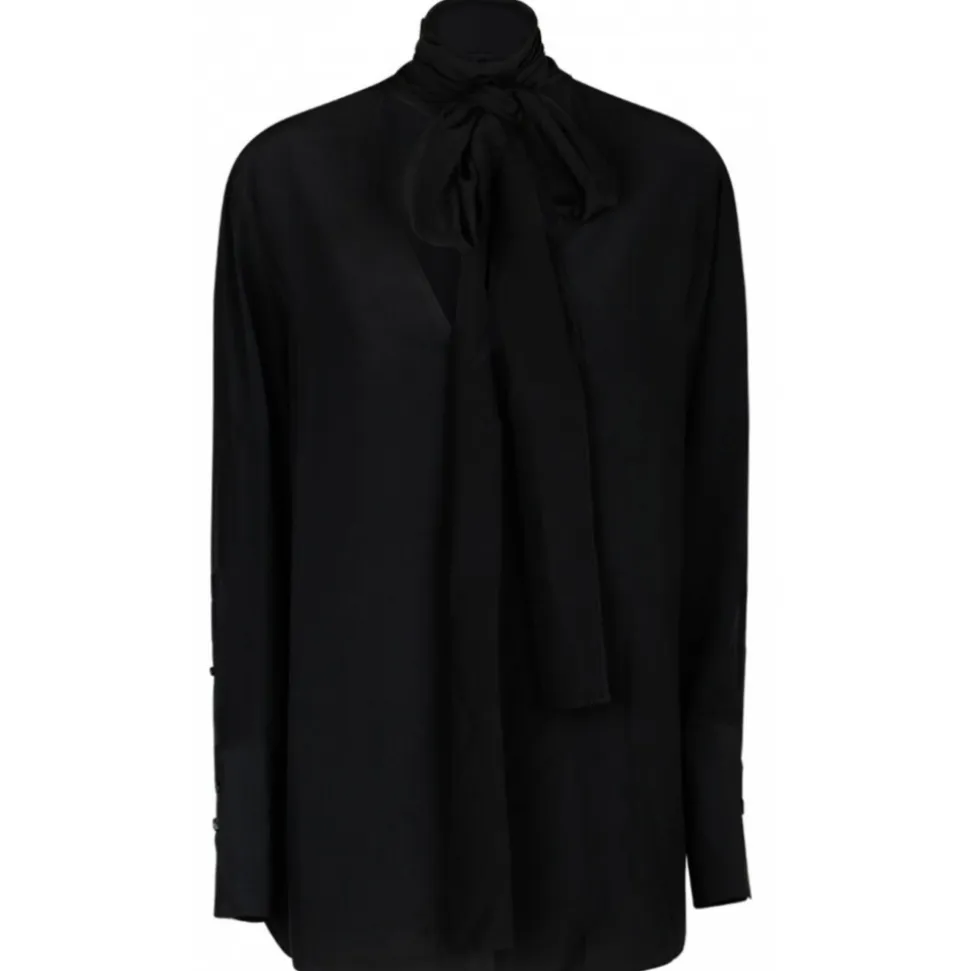 Givenchy Black Silk Blouse. Black silk blouse, long sleeves, long buttoned removable lavalliere, pluming V neckline and buttoned cuffs.