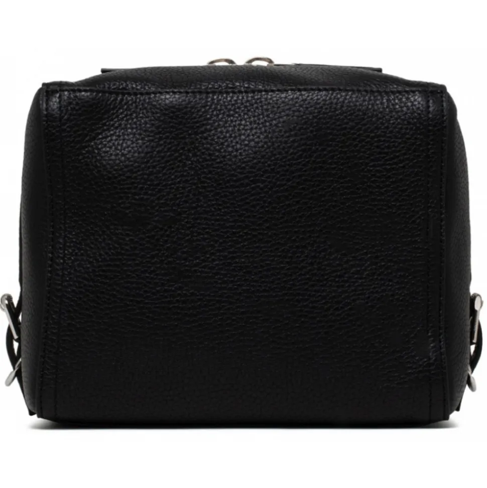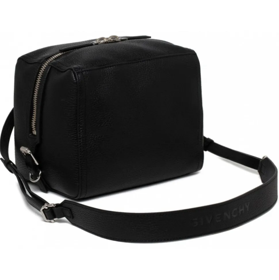 Givenchy Black Small Pandora Bag. Black small shoulder bag in full grain deerskin, Pandora line, metal zip closure. Leather zip puller and wide opening, adjustable shoulder strap, Givenchy signature embossed on the shoulder strap. Metallic Givenchy signature on the top, metal buckles, silver finish metal details. One large main zip compartment, one flat pocket on the back, canvas lining.